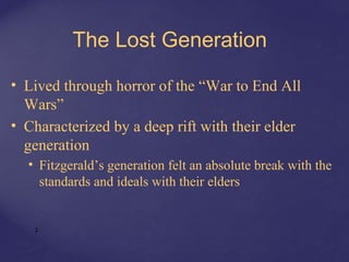 F. Scott Fitzgerald was an American author born in 1896 in Minnesota. He is best known for chronicling the Jazz Age in the 1920s and his most famous work, The Great Gatsby. Fitzgerald grew up in a declining family but was able to attend private schools with help from relatives. He dropped out of Princeton to join the army during WWI. After the war, he moved to New York to pursue writing full-time while also working an advertising job. His first novel, This Side of Paradise, was a success in 1920. Fitzgerald married Zelda Sayre later that year. They lived lavishly but struggled with debt and alcoholism for the rest of their lives. Fitzgerald's later works including The Great G