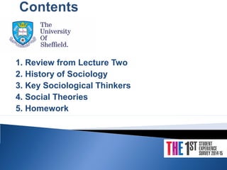 The document discusses the history and development of sociology. It outlines how sociology emerged in response to the Industrial and French Revolutions, which prompted thinkers like Comte, Durkheim, Marx, and Weber to develop theories to understand rapidly changing social structures. It summarizes their key ideas, like Comte's positivism, Durkheim's concept of social facts, Marx's focus on class conflict under capitalism, and Weber's emphasis on rationalization and social action. Overall, the document traces how sociology established itself as a science aimed at understanding social order, change, and problems in modern industrial societies.