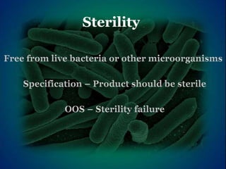 The document outlines procedures and considerations for pharmaceutical sterility testing, including sources of contamination, investigation phases for out-of-specification (OOS) results, and the roles of analysts and supervisors in identifying root causes. It emphasizes the importance of thorough laboratory and manufacturing investigations, particularly in microbiological contexts, and provides guidelines for batch disposition decisions based on OOS findings. The investigation process includes phases for identifying errors, retesting, and implementing corrective and preventive actions, ensuring compliance with regulatory standards.