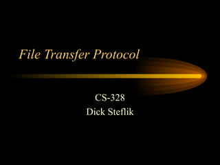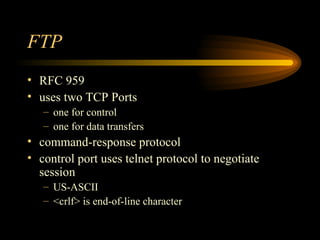 FTP uses two TCP ports, one for control commands and one for data transfers. It uses a command-response protocol over the control port with US-ASCII formatting. There are two main connection modes for FTP - active and passive. Active mode has the client connect to the server's command port to initiate the session, while passive mode has the client open random ports that the server connects to. FTP supports different file structures, data types, and transmission modes to handle file transfers across heterogeneous systems.