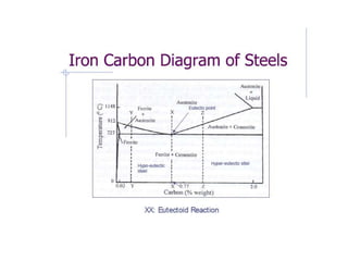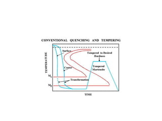 Tempering is a heat treatment process that reduces the brittleness of hardened steel without significantly lowering its hardness and strength. It involves heating hardened steel to a temperature below the eutectoid temperature and allowing it to cool slowly. This process reduces brittleness by allowing the formation of tempered martensite from martensite and decreasing internal stresses. Tempering may also cause some reduction in hardness. In alloy steels, tempering can result in secondary hardening due to precipitation of alloy carbides that increase hardness even as tempering progresses.