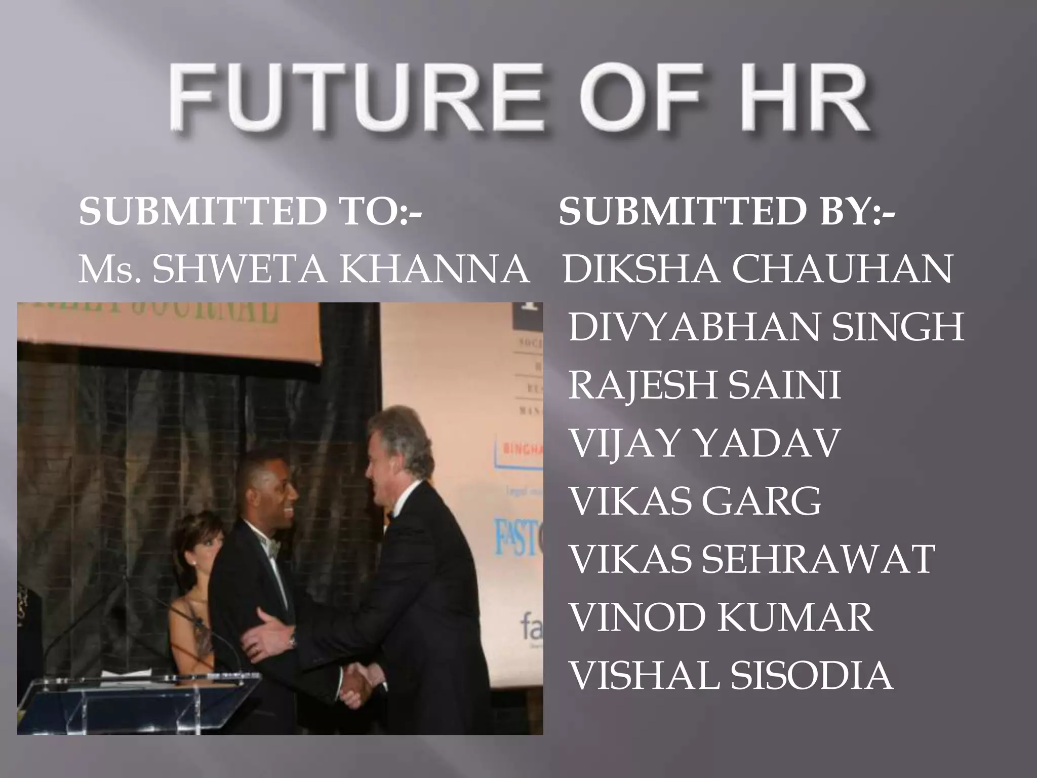 The document discusses the future of human resource management (HRM). It notes that HRM roles are shifting from local to global operations and from manufacturing to knowledge work. New challenges for HRM include attracting and retaining talent, improving organizational capabilities, and developing leadership skills. The future of HRM may see it replacing social welfare systems by providing total employee care so they can focus on performance. New criteria for evaluating HRM include profit per employee and costs related to injuries and disputes. HRM roles are also becoming more distributed and diffuse, involving relationship management and knowledge work instead of traditional personnel administration.