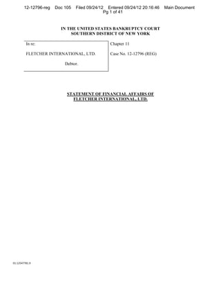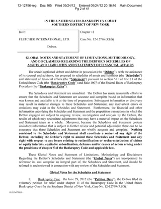 This document contains notes summarizing Fletcher International, LTD's process for preparing its Statement of Financial Affairs in bankruptcy court. It discloses that the statement is unaudited and subject to change. It also contains accounting policies like basing investment valuations on estimates from an external advisor and recording securities transactions on a trade-date basis. The notes are intended to provide transparency about the limitations and methodologies used to complete the Statement of Financial Affairs.