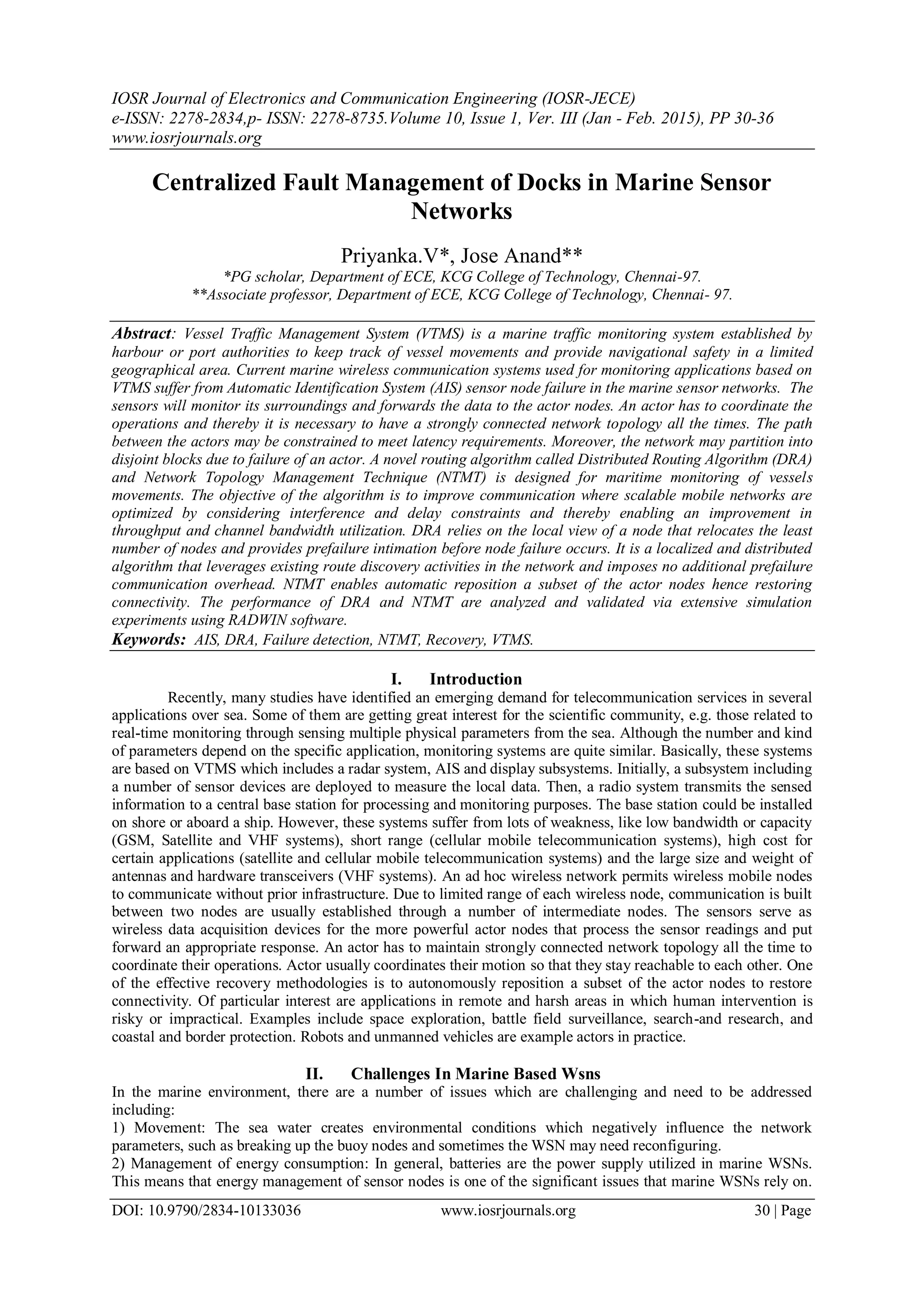 This document discusses centralized fault management of docks in marine sensor networks. It proposes a distributed routing algorithm (DRA) and network topology management technique (NTMT) to address issues with existing systems. DRA allows for pre-failure detection of nodes by having nodes send heartbeat messages to neighbors. If a node fails, NTMT selects a replacement node from the smallest affected network partition and coordinates moving related nodes to restore connectivity while maintaining existing links. The techniques are analyzed through simulations which show improvements over previous approaches by enabling pre-failure detection and recovery without significantly increasing path lengths or overhead.