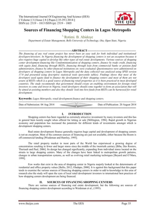 The study examines the sources of financing for shopping center development in Lagos, Nigeria, revealing that most developers primarily use equity funds and are largely unaware of Real Estate Investment Trusts (REITs). Data collected through questionnaires indicate that while equity funds are deemed the most suitable option, developers face challenges due to limited available financing options. The study recommends the establishment of a supportive framework for REITs and the formation of an association for retail developers to foster collaboration and improve access to financing.