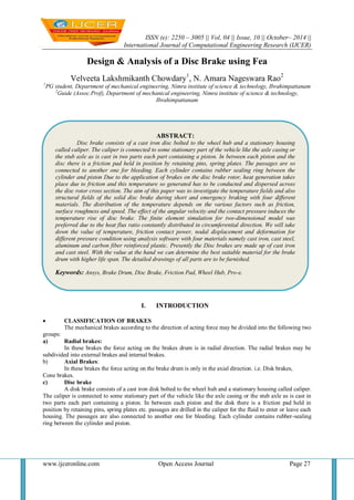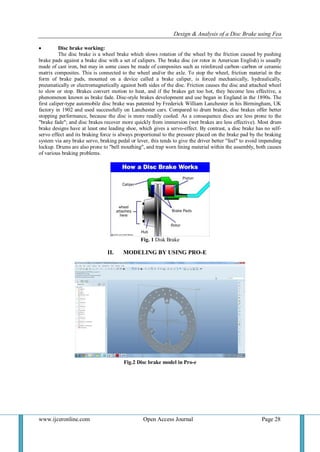 This document summarizes the design and analysis of a disc brake using finite element analysis. It begins with an introduction to brake classifications and an overview of disc brake components and operation. The author then describes modeling a disc brake in Pro-E and analyzing it using finite element analysis to study thermal effects and structural stresses under different operating conditions. Four materials were analyzed: nickel chrome steel, aluminum alloy, cast iron, and carbon reinforced polymer. The results showed carbon reinforced polymer had the best performance with stresses within limits and lower vibrations and weight. Therefore, the summary concludes carbon reinforced polymer is the best material for disc brakes.