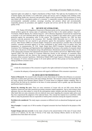 This document reports on a study that examined consumer awareness of rights in Kamrup Metro District of Assam, India. The study had two objectives: 1) To study consumer awareness of the rights enshrined in the Consumer Protection Act; and 2) To examine the adequacy of protections for fulfilling consumer expectations. A sample of 100 consumers was surveyed using a questionnaire. Results found that awareness varied by demographics like age, education and gender. Regression analysis indicated that age was a significant predictor of awareness levels, with older consumers having greater knowledge of rights. While current protections have increased awareness, the study found there is still room for improvement in fulfilling consumer expectations.