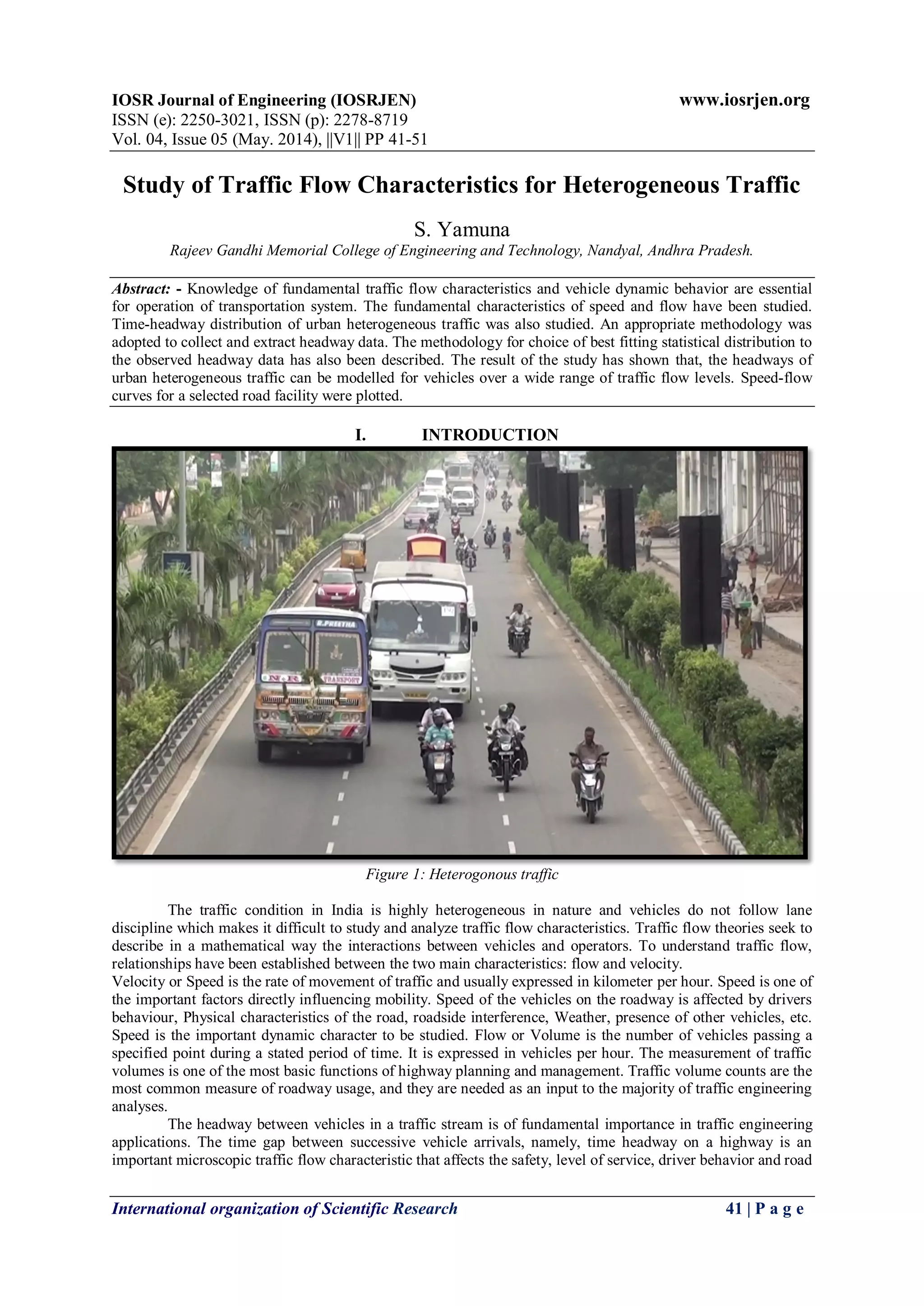 This document summarizes a study of traffic flow characteristics for heterogeneous traffic in India. Speed, flow, and time headway data were collected from a six-lane urban road and analyzed. Headways between different vehicle combinations were found to best fit several statistical distributions. Speed-flow curves were plotted to determine the speed at which optimal flow occurs, though the study was limited by only using one hour of data. The results provide insight into modeling headways and understanding traffic flow in heterogeneous, mixed traffic conditions.
