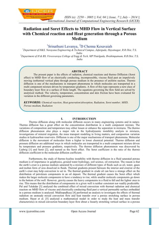 The document discusses the effects of radiation, chemical reactions, and the Soret effect on magnetohydrodynamic (MHD) flow of an electrically conducting fluid over a vertical plate in a porous medium. It provides an analytical solution to the governing equations that describe the flow, temperature, and concentration variations in response to various parameters. The study emphasizes the significance of thermo-diffusion in practical applications such as oil extraction and nuclear reactors.
