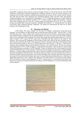 This study investigates the mechanical properties of bio-composite materials using munja fibers, which are eco-friendly and lightweight alternatives in various engineering applications. The research employs hand lay-up and cold-press methods to fabricate composites, revealing significant improvements in flexural strength when using treated fibers. Results indicate the potential of munja fiber composites to replace traditional materials in areas such as automotive and aerospace, highlighting their benefits in terms of cost and sustainability.