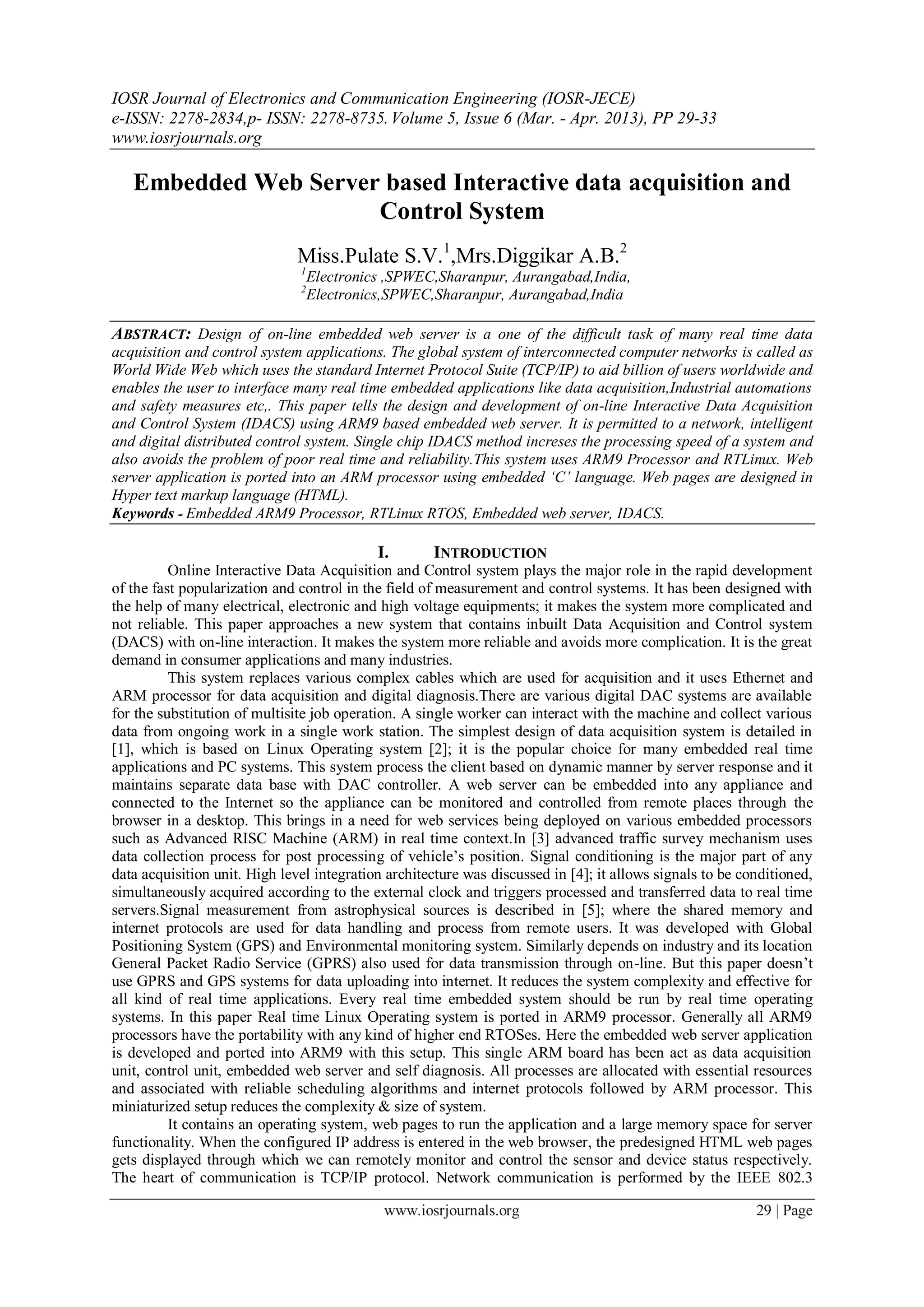 This document summarizes an embedded web server based interactive data acquisition and control system. The system uses an ARM9 processor running RTLinux to both acquire data from sensors and control industrial devices. It allows remote monitoring and control via a web browser. The ARM9 handles data acquisition, control functions, and an embedded web server simultaneously. Analog sensor signals are converted to digital with an ADC and stored in external memory. The web server portion allows clients to access the stored data and send control instructions via HTML pages. This embedded single-board solution provides reliable real-time data acquisition and remote control capabilities with low resource usage.