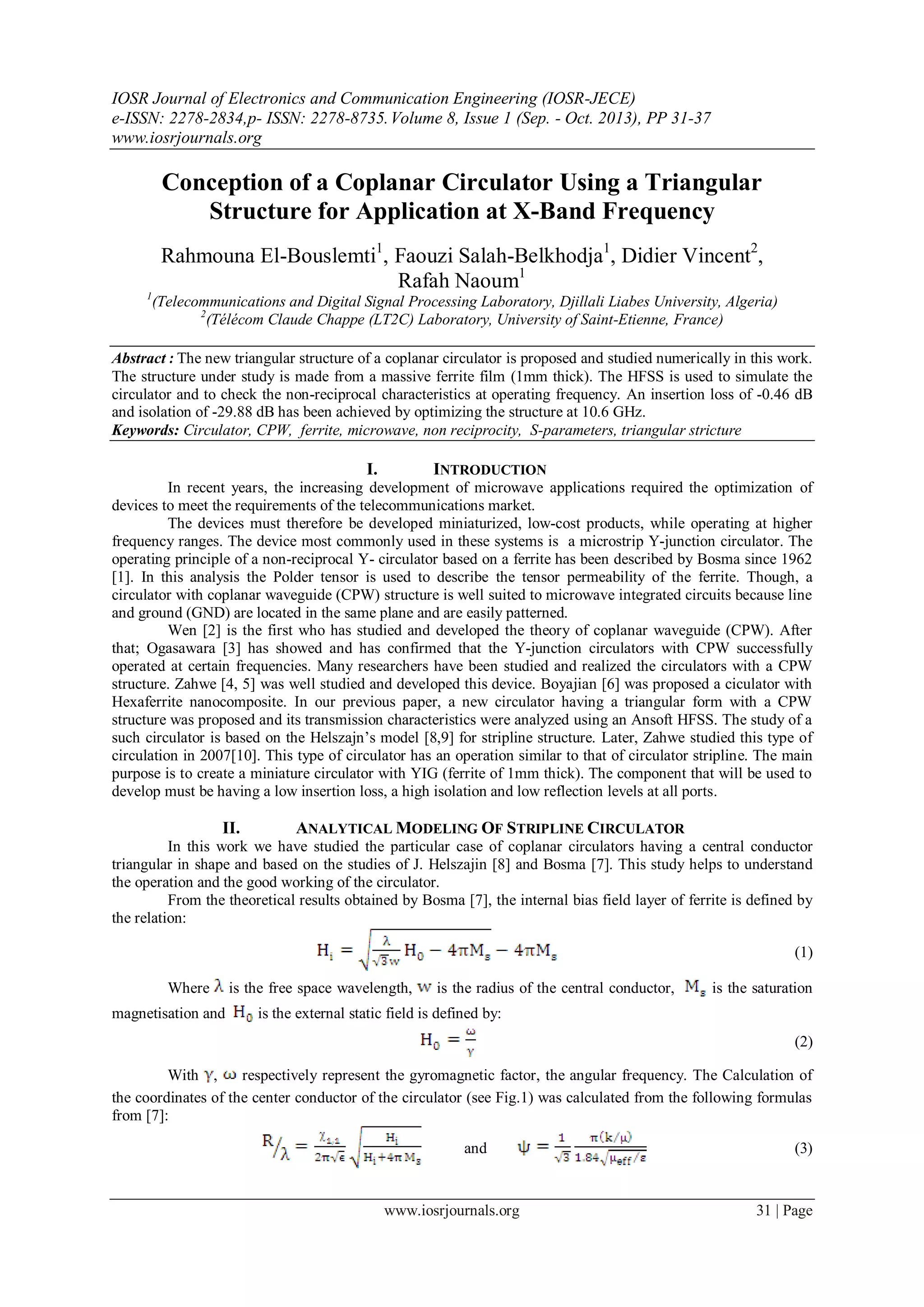 This document summarizes the numerical study of a triangular coplanar circulator using a ferrite film for application at X-band frequency. Simulation results showed an insertion loss of -0.46 dB and isolation of -29.88 dB was achieved at an operating frequency of 10.6 GHz after optimizing the structure dimensions. The triangular structure with a ground plane provided non-reciprocal transmission between ports. Parameters like the signal line width and spacing, ground plane radius, and ferrite linewidth were analyzed to understand their impact on circulator performance. Compared to prior work, the proposed triangular design demonstrated lower losses and better isolation.