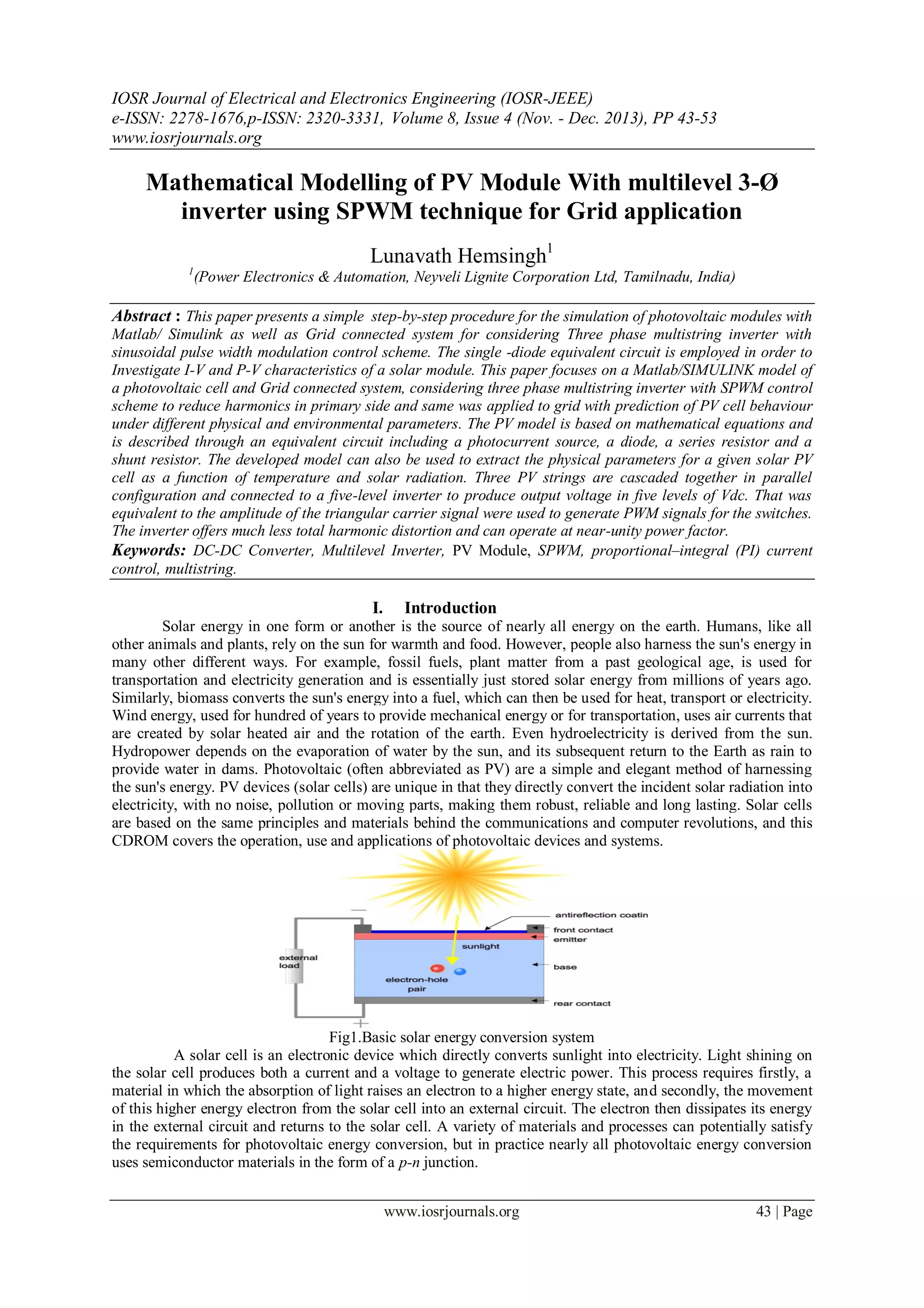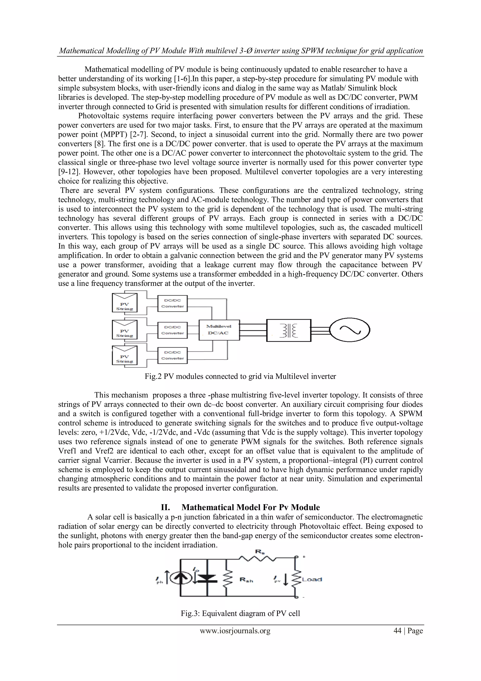 1. The document presents a mathematical model of a photovoltaic (PV) module and grid-connected system using a three-phase multistring inverter with sinusoidal pulse width modulation (SPWM) control scheme.