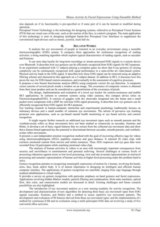This document summarizes research on using facial expressions and eye movements to control a computer without using a mouse. It describes a system that uses the nose as a pointer and blinking eyes for clicking. The system achieves an average precision of 76.1% and recall of 70.5% in recognizing facial expressions and eye movements. It also discusses other related works on using electrooculography sensors and eye tracking for human-computer interaction applications.