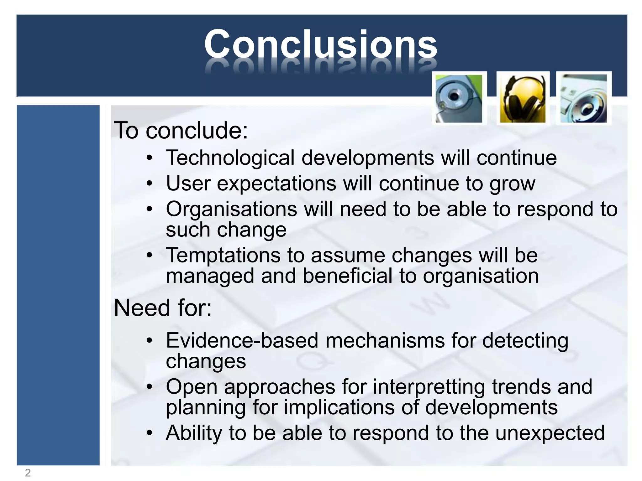 This document summarizes conclusions from a workshop on predicting the future and discusses several reports on emerging trends. It finds that technological change will continue rapidly, requiring organizations to respond flexibly. It advocates evidence-based monitoring of developments and open interpretation of implications. Several reports are highlighted, including from NMC, IFLA and ETAG, identifying trends like increased mobility, openness and challenges to traditional models of education. Scenario planning is proposed to help organizations prepare for potential futures.