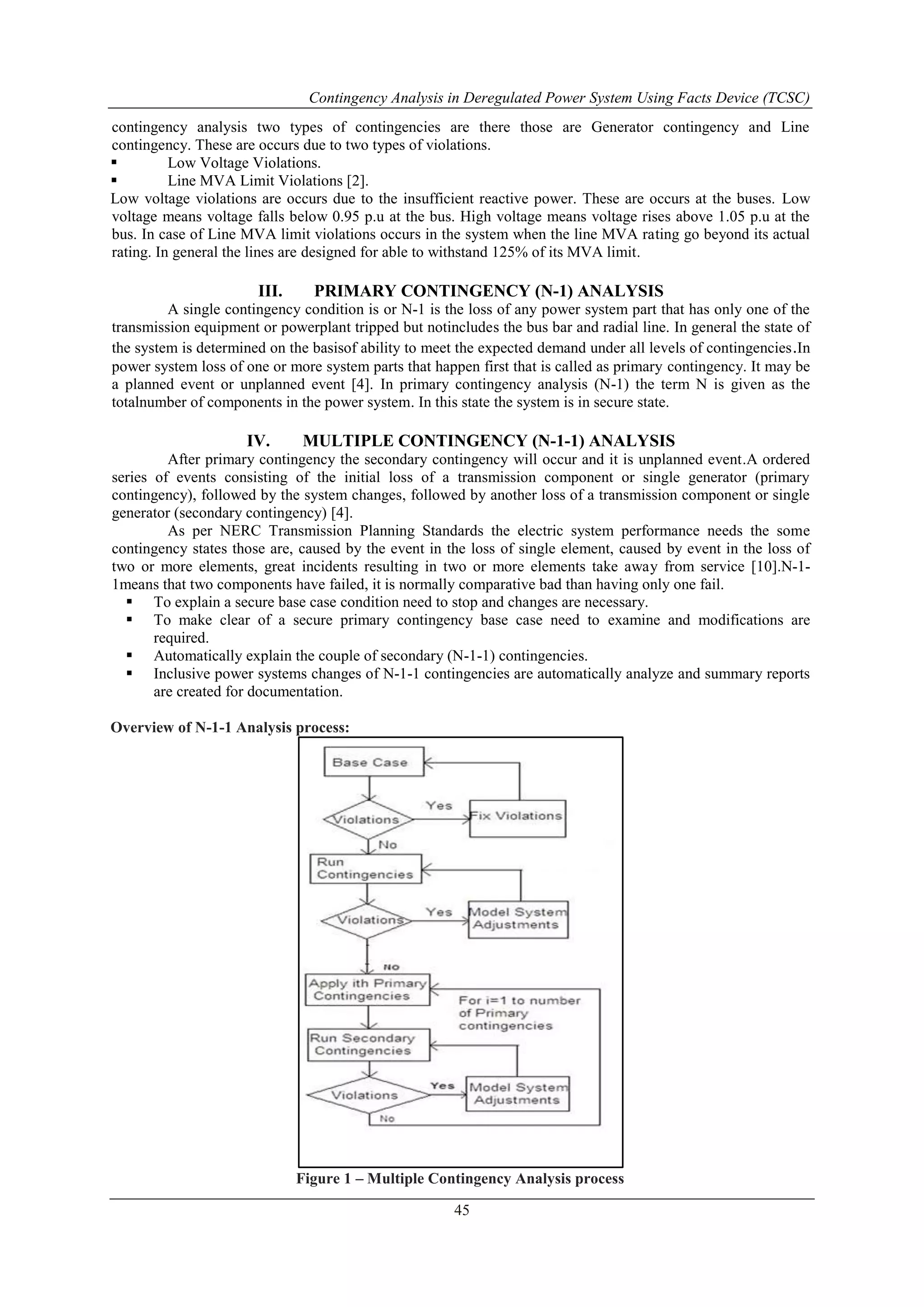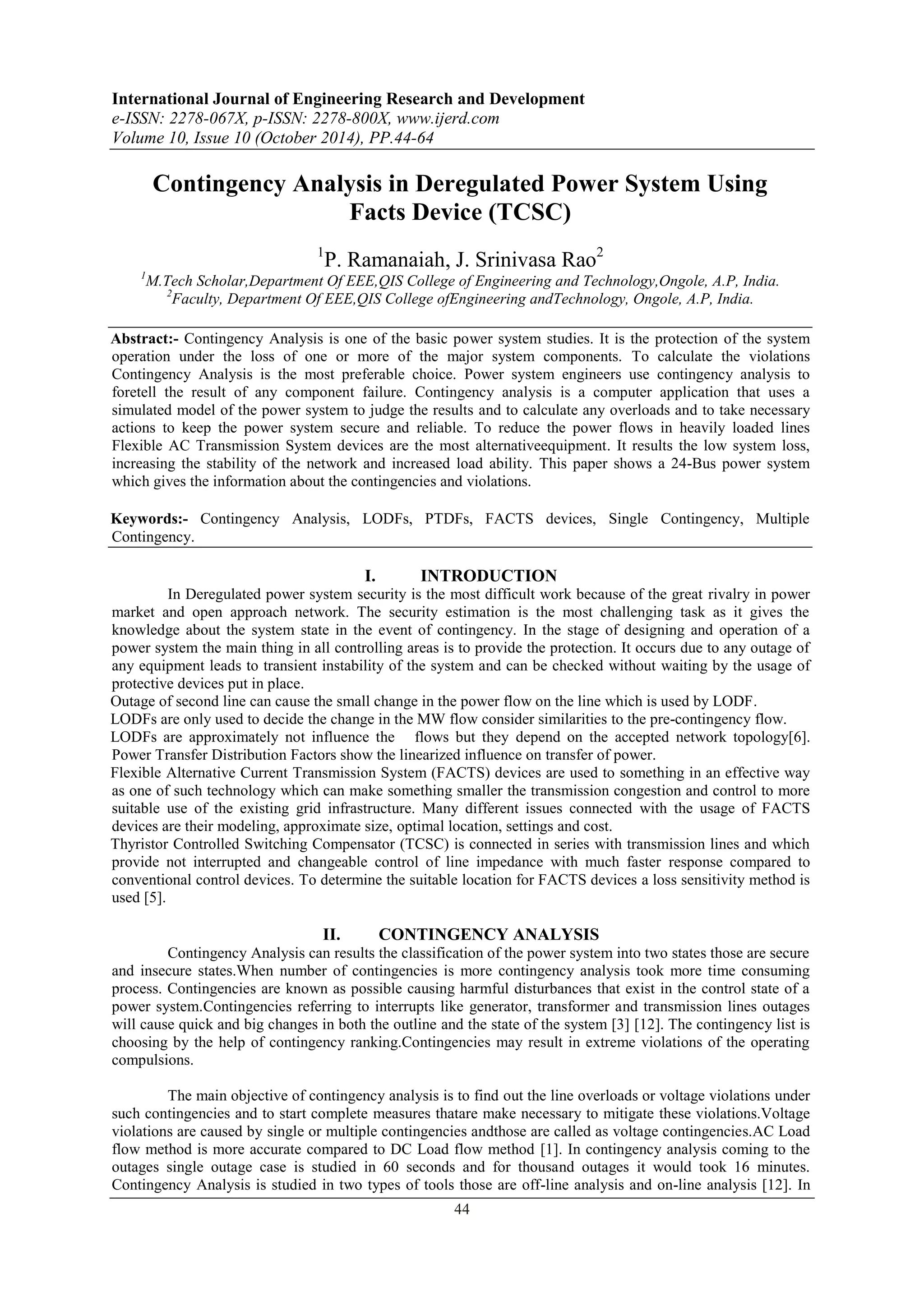 The document discusses contingency analysis in deregulated power systems, focusing on the significance of flexibility AC transmission system (FACTS) devices, particularly the Thyristor Controlled Series Capacitor (TCSC), to enhance network stability and performance. It outlines the methodology for analyzing system states under various contingencies, including single and multiple outages, and presents simulation results from a 24-bus power system indicating the effectiveness of the approach. The paper emphasizes the importance of accurate modeling and sensitivity analysis to mitigate violations and improve overall power system reliability.
