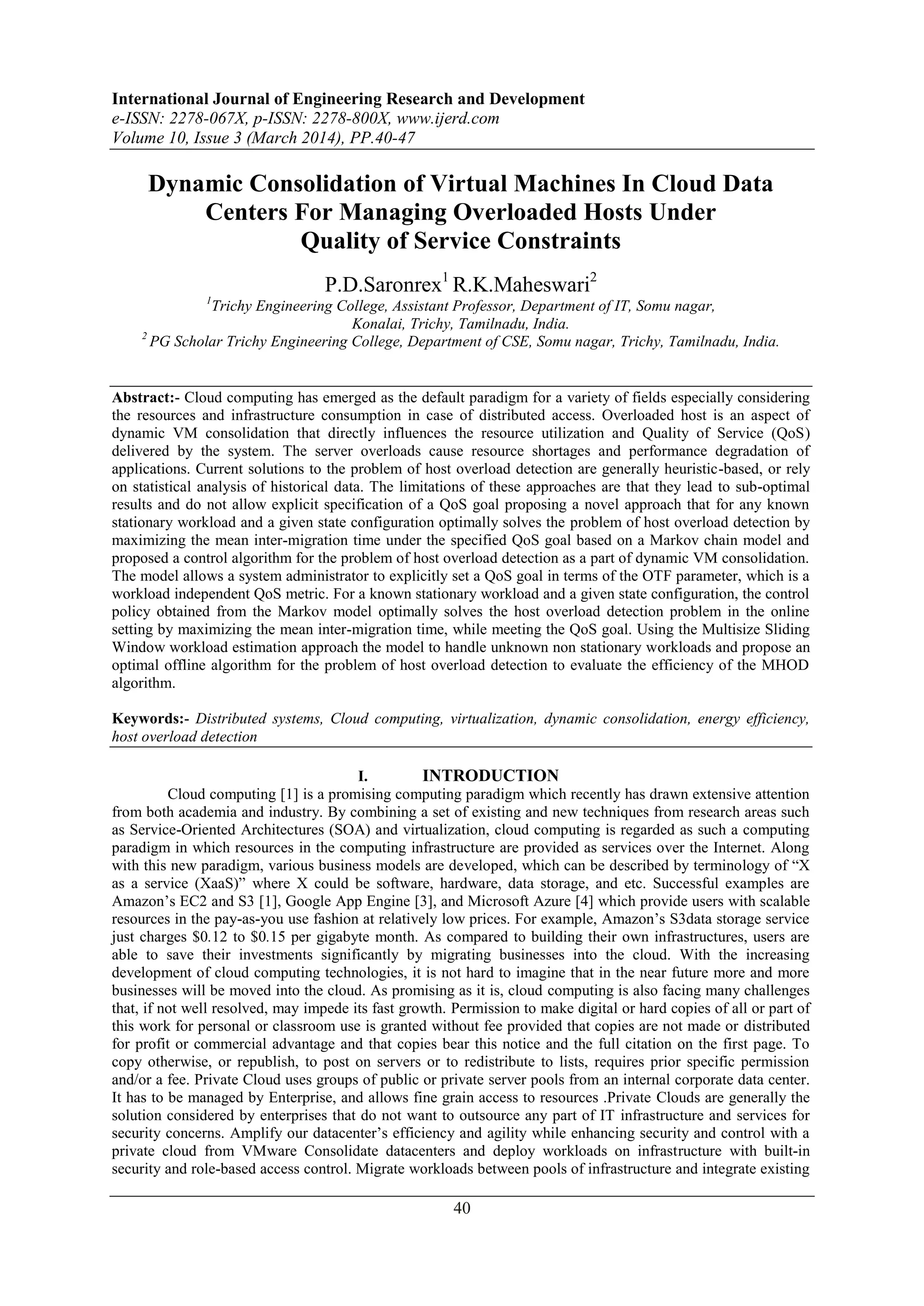 This document summarizes a research paper on dynamic consolidation of virtual machines in cloud data centers to manage overloaded hosts while maintaining quality of service constraints. It proposes using a Markov chain model and control algorithm to optimally detect host overloads by maximizing the average time between VM migrations, while meeting a specified QoS goal. The algorithm handles unknown workloads using a multisize sliding window approach. Evaluation shows the algorithm efficiently solves the problem of host overload detection as part of dynamic VM consolidation in cloud computing systems.