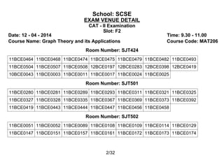 This document provides exam venue details for three courses taking place on April 12, 2014 from 9:30-11:00. It lists the room numbers and student IDs assigned to each room for the exams in Graph Theory and its Applications, Algorithm Design and Analysis, and Discrete Mathematical Structures.