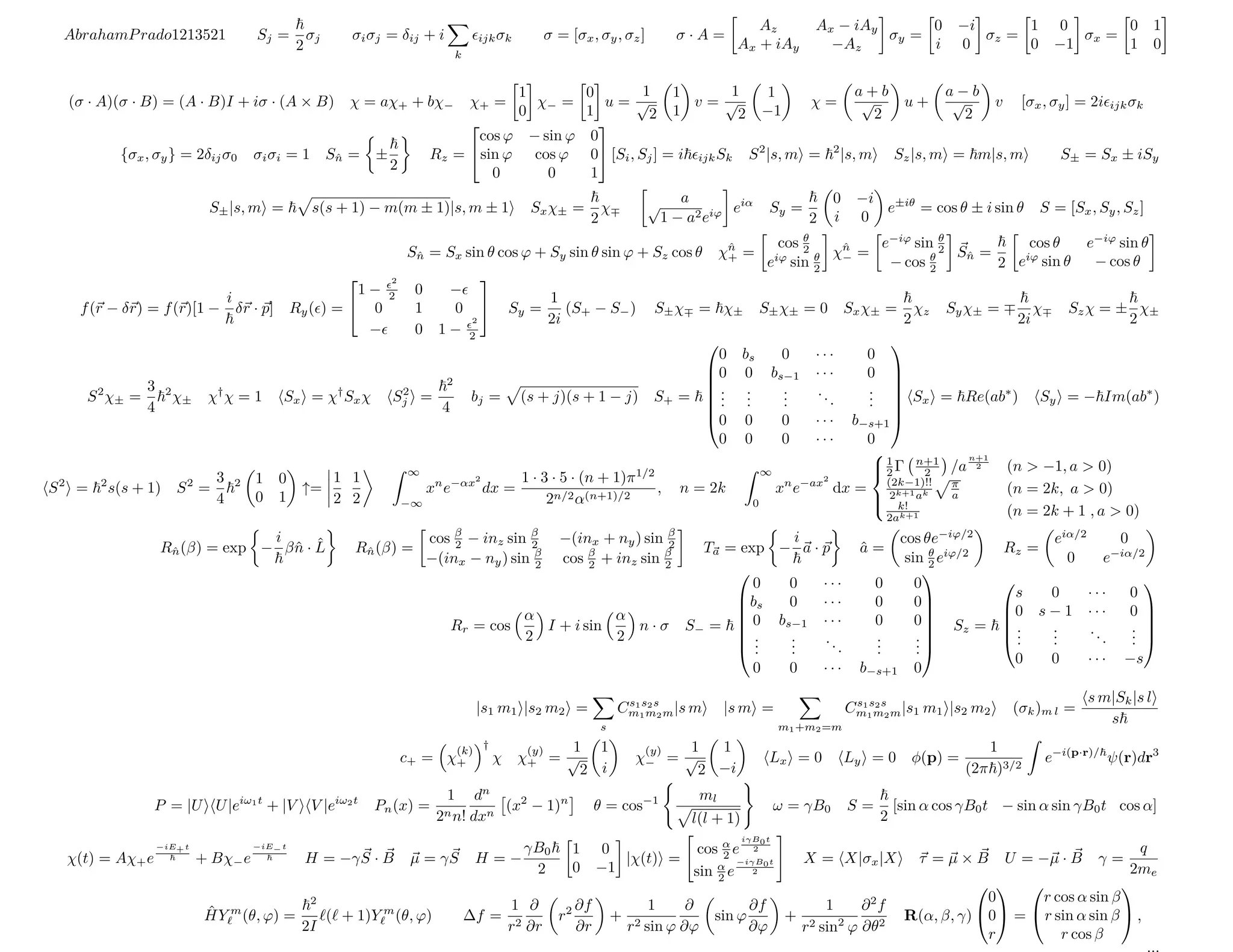 This document contains mathematical formulas and definitions related to quantum mechanics, spin, angular momentum, spherical harmonics, and other physics concepts. It includes expressions for spin operators, spherical harmonics, raising and lowering operators, eigenstates of the quantum harmonic oscillator, and Legendre polynomials. Operators, matrices, eigenstates, and other quantum mechanical notation are used throughout.