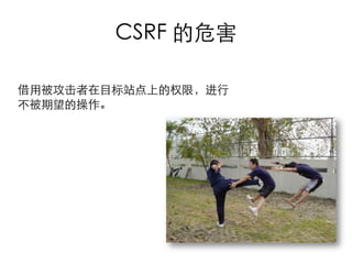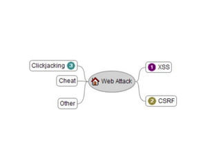 This document summarizes common web vulnerabilities including cross-site scripting (XSS), cross-site request forgery (CSRF), and clickjacking. It provides examples of how each vulnerability can be exploited, such as using JavaScript to steal cookies or make unauthorized requests. The document also lists recommendations for preventing these issues, like validating and sanitizing input, using anti-CSRF tokens, and disabling JavaScript for sensitive pages. Resources for further reading on each topic are included.