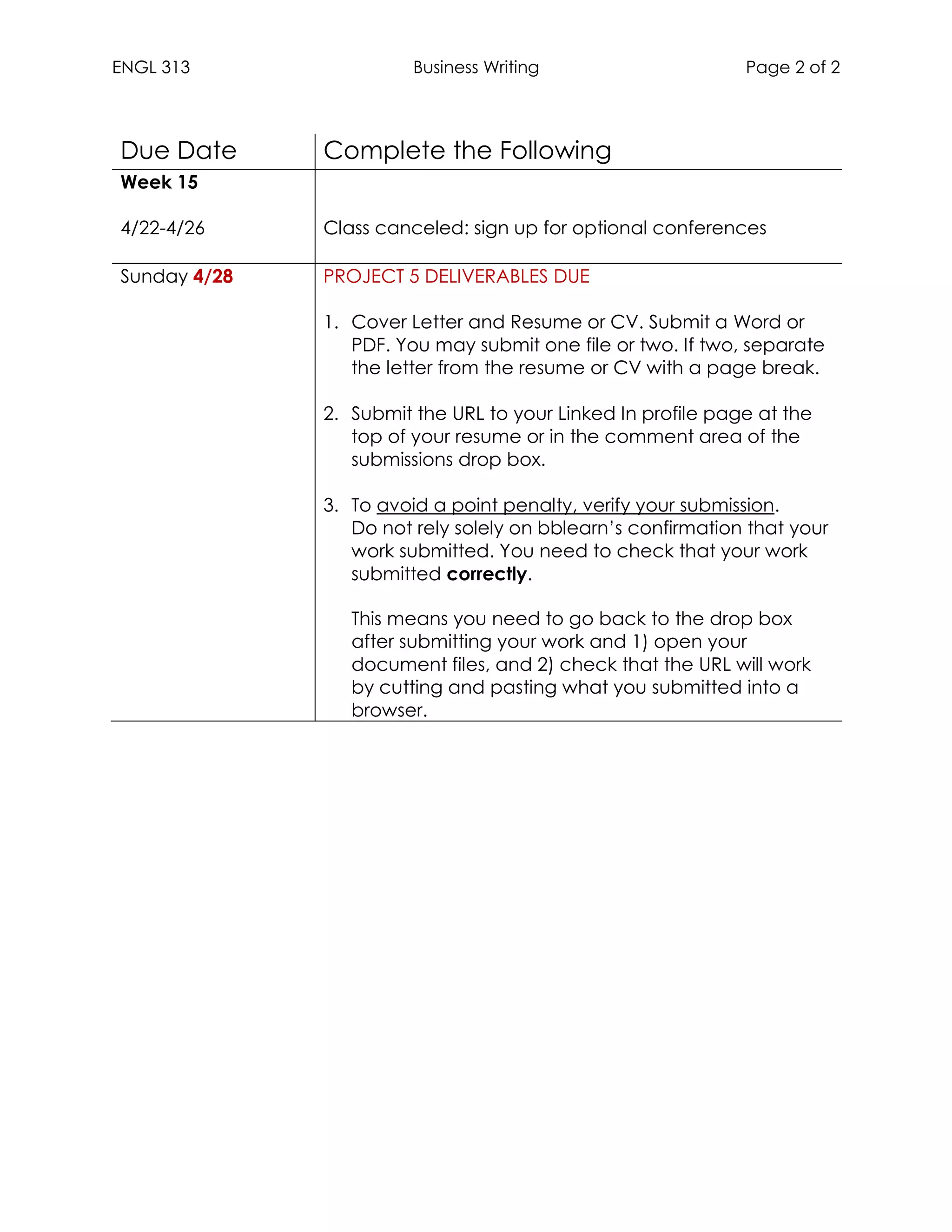 This document provides a schedule for Project 5, which focuses on developing a professional identity through creating a resume or CV and cover letter. It outlines the homework and in-class activities for weeks 14 and 15, including analyzing a job posting or graduate program, drafting the resume/CV and cover letter, and discussing tips for developing a strong student profile. All project deliverables, including the final cover letter and resume/CV, and a link to the student's LinkedIn profile, are due by April 28th. Students are responsible for verifying their submission is correct.