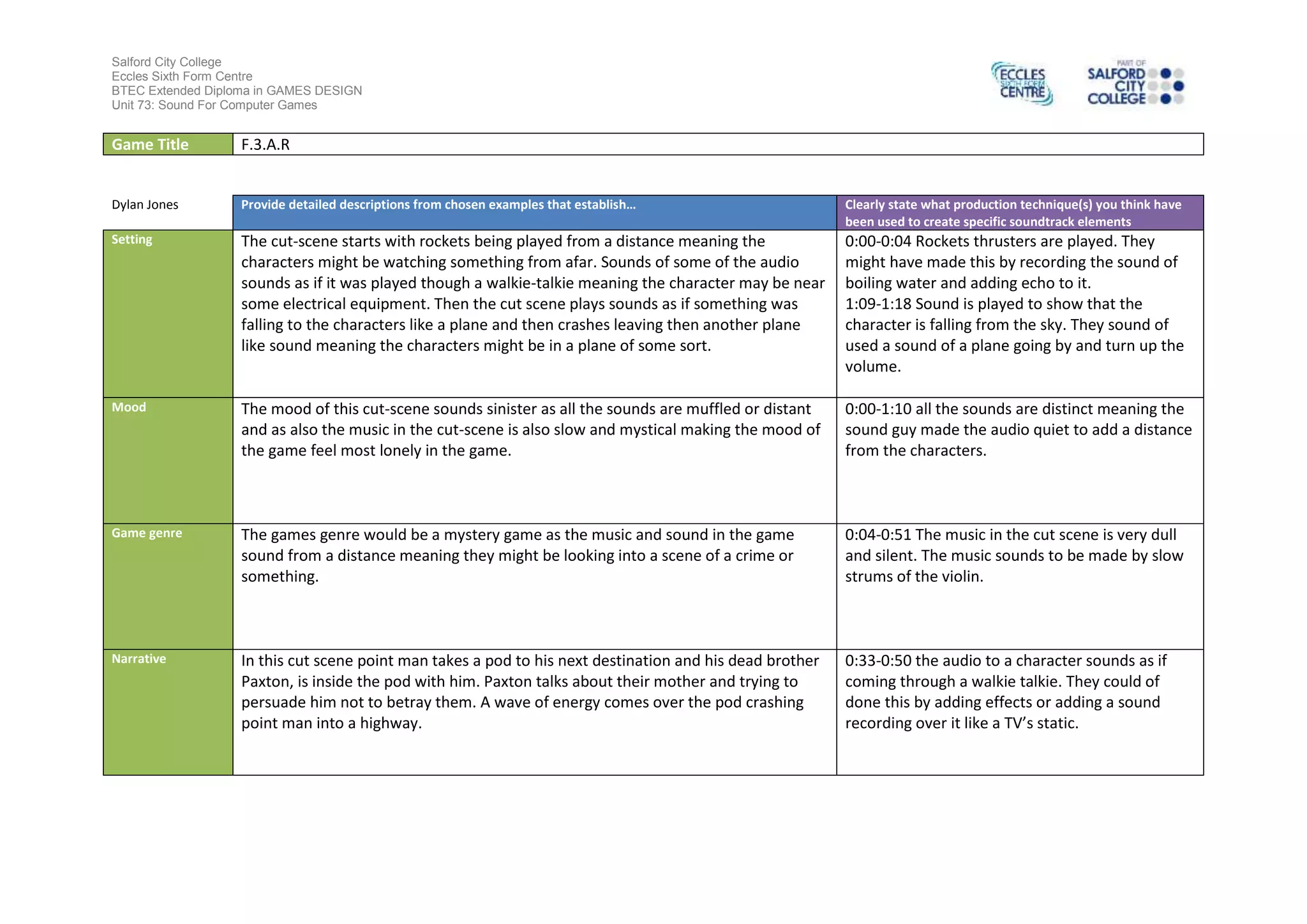 The document provides an analysis of sound elements in the game F.3.A.R. It describes specific time periods in a cut scene and the sounds heard, such as rockets in the distance and a falling plane. It suggests production techniques used to create the sounds, such as recording boiling water for rocket thrusters and increasing the volume of a plane recording. The mood created by the sounds and music is described as sinister, lonely, and mystical. The genre is identified as mystery based on distant sounds. The narrative of the cut scene involves a character in a crashing pod speaking to his dead brother.