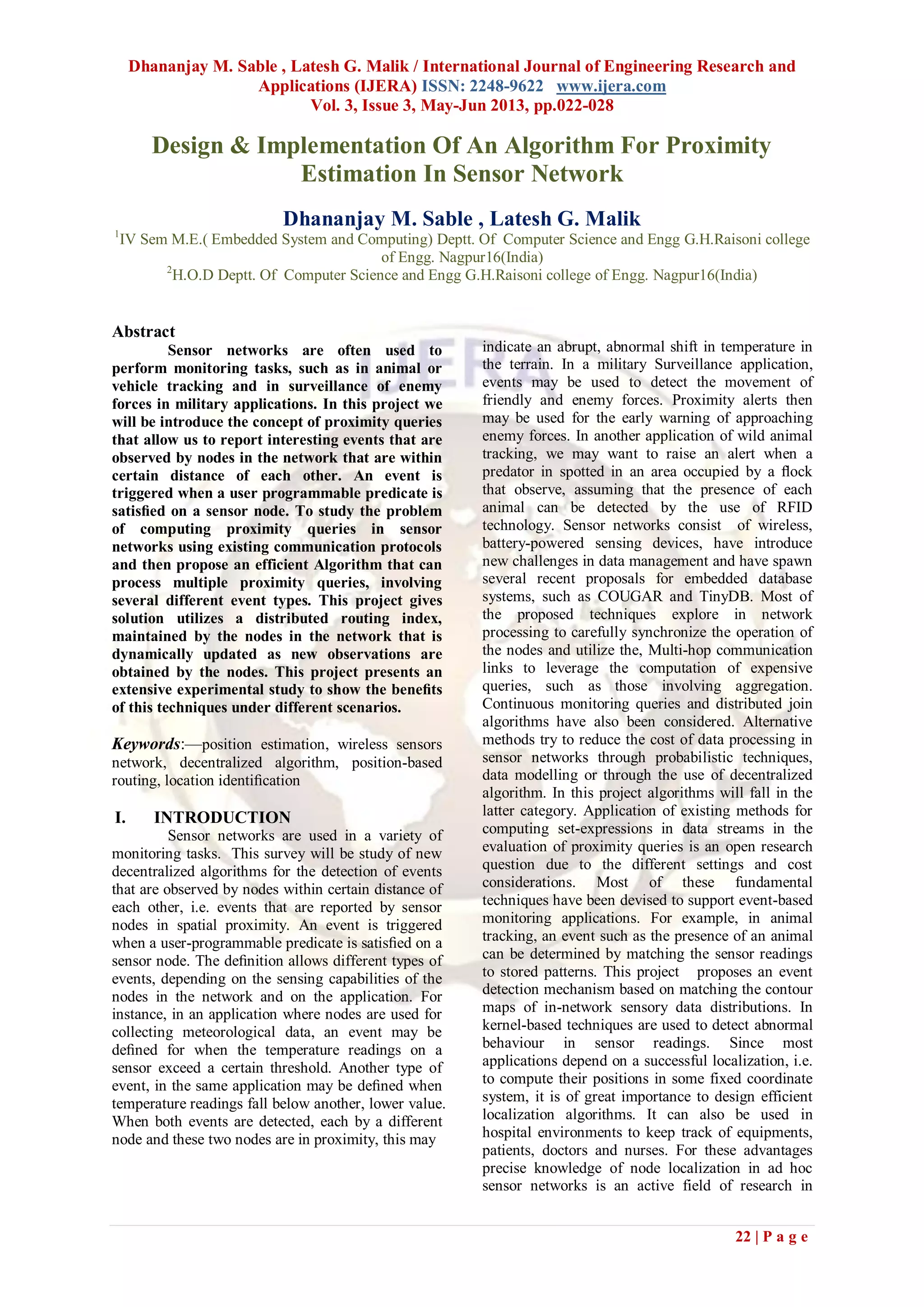 This document summarizes research on algorithms for proximity estimation in sensor networks. It discusses using sensor networks to detect events observed by nodes within a certain distance of each other. It proposes an algorithm that utilizes a distributed routing index maintained by nodes in the network to process multiple proximity queries involving different event types. The document reviews several related works on localization algorithms, data-centric sensor networks, geographic routing protocols, and node localization techniques. It evaluates different wireless sensor network simulators and deployment schemes.