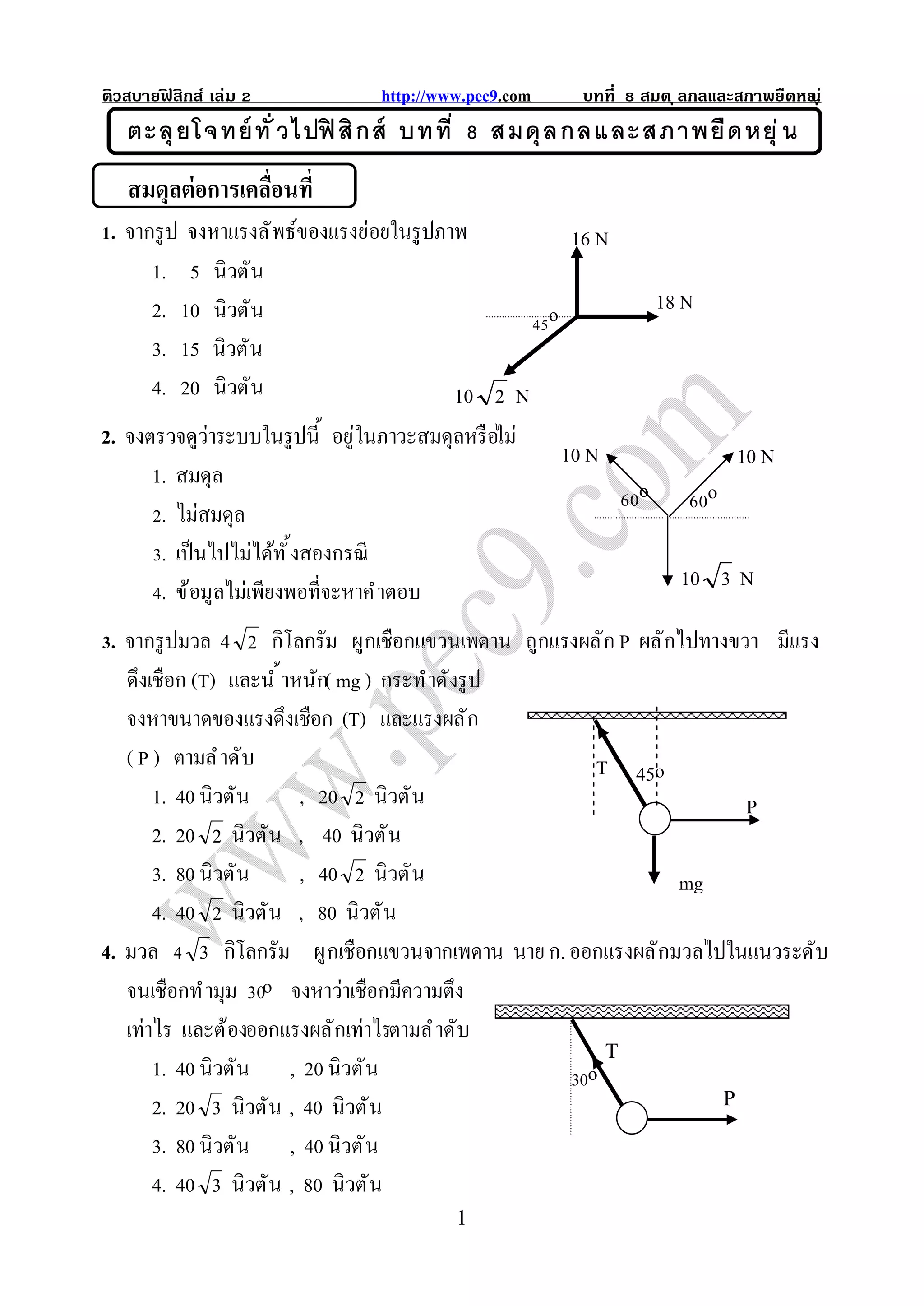 ิ http://www.pec9.com บทที สมด ุ ลกลและสภาพยืดหย ุ ่ น ตะลุ ยโจทย์ ทั วไปฟิ สิ ก ส์ บทที สมดุ ล กลและสภาพยื ด หยุ ่ น สมดุลต่อการเคลือนที . จากรู ป จงหาแรงลั พธ์ของแรงย่อยในรู ปภาพ 16 N 1. 5 นิวตัน 2. 10 นิวตัน o 18 N 3. 15 นิวตัน 4. 20 นิวตัน 10 2 N 2. จงตรวจดูว่าระบบในรู ปนี อยู่ในภาวะสมดุลหรื อไม่ 10 N 10 N 1. สมดุล o o . ไม่สมดุล . เป็ นไปไม่ได้ทั งสองกรณี . ข้อมูลไม่เพียงพอทีจะหาคํ าตอบ 10 3 N . จากรู ปมวล 4 2 กิโลกรัม ผูกเชือกแขวนเพดาน ถูกแรงผลั ก P ผลั กไปทางขวา มีแรง ดึงเชือก (T) และนํ าหนัก( mg ) กระทํ าดังรู ป จงหาขนาดของแรงดึงเชือก (T) และแรงผลั ก ( P ) ตามลํ าดับ T 45o 1. 40 นิวตัน , 20 2 นิวตั น P 2. 20 2 นิวตัน , 40 นิวตั น 3. 80 นิวตัน , 40 2 นิวตั น mg 4. 40 2 นิวตัน , 80 นิวตั น 4. มวล 3 กิโลกรัม ผู กเชือกแขวนจากเพดาน นาย ก. ออกแรงผลั กมวลไปในแนวระดับ จนเชือกทํ ามุม o จงหาว่าเชือกมีความตึง เท่าไร และต้องออกแรงผลั กเท่าไรตามลํ าดับ T 1. 40 นิวตัน , 20 นิวตั น 30o 2. 20 3 นิวตัน , 40 นิวตั น P 3. 80 นิวตัน , 40 นิวตั น 4. 40 3 นิวตัน , 80 นิวตั น 1