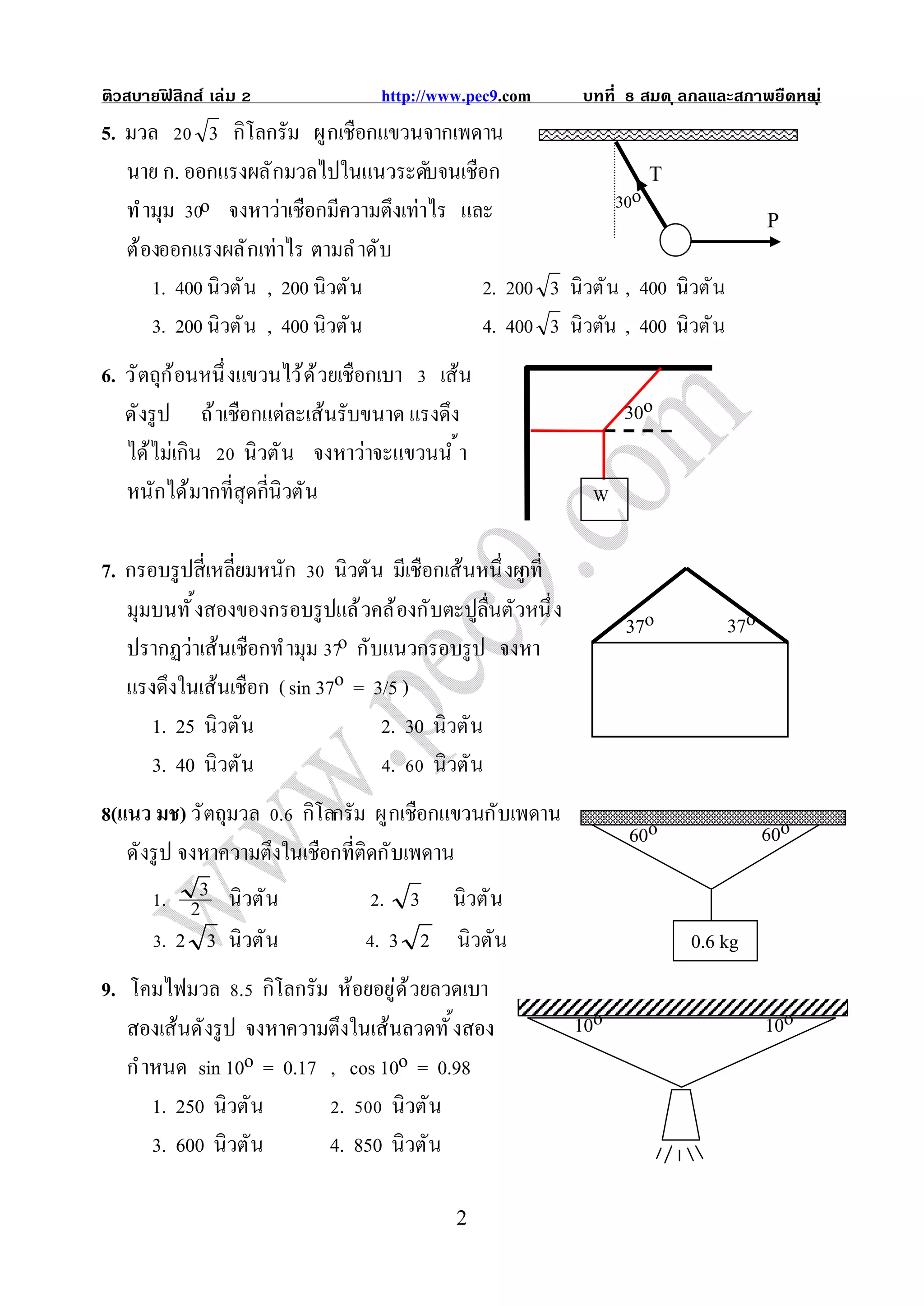 ิ http://www.pec9.com บทที สมด ุ ลกลและสภาพยืดหย ุ ่ น 5. มวล 3 กิโลกรัม ผู กเชือกแขวนจากเพดาน นาย ก. ออกแรงผลั กมวลไปในแนวระดับจนเชือก T ทํ ามุม o จงหาว่าเชือกมีความตึงเท่าไร และ 30o P ต้องออกแรงผลั กเท่าไร ตามลํ าดับ 1. 400 นิ วตั น , 200 นิ วตั น 2. 200 3 นิ วตั น , 400 นิ วตั น 3. 200 นิ วตั น , 400 นิ วตั น 4. 400 3 นิ วตัน , 400 นิ วตั น 6. วั ตถุก ้อนหนึ งแขวนไว้ ด ้ วยเชือกเบา เส้น ดังรู ป ถ้ าเชือกแต่ละเส้นรับขนาด แรงดึง 30o ได้ไม่เกิน นิวตั น จงหาว่าจะแขวนนํ า หนักได้มากทีสุดกีนิวตัน W 7. กรอบรู ปสีเหลียมหนัก นิวตัน มีเชือกเส้นหนึ งผูกที มุมบนทั งสองของกรอบรู ปแล้ วคล้ องกับตะปูลืนตัวหนึ ง 37o 37o ปรากฏว่าเส้นเชือกทํ ามุม o กับแนวกรอบรู ป จงหา แรงดึงในเส้นเชือก ( sin 37o = 3/5 ) 1. 25 นิวตัน 2. 30 นิวตัน 3. 40 นิวตัน . นิวตัน 8(แนว มช) วั ตถุมวล . กิโลกรัม ผู กเชือกแขวนกับเพดาน 60o 60o ดังรู ป จงหาความตึงในเชือกทีติดกับเพดาน . 23 นิวตัน . 3 นิวตัน . 2 3 นิวตัน . 3 2 นิวตัน 0.6 kg 9. โคมไฟมวล . กิโลกรัม ห้อยอยู่ด ้ วยลวดเบา สองเส้นดังรู ป จงหาความตึงในเส้นลวดทั งสอง 10o 10o กํ าหนด sin 10o = 0.17 , cos 10o = 0.98 1. 250 นิวตัน . นิวตัน 3. 600 นิวตัน 4. 850 นิวตัน 2