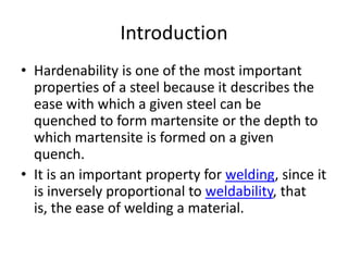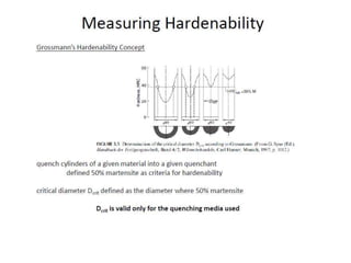 The document discusses the Jominy end quench test for determining the hardenability of steels. It describes how a standardized test sample is austenitized and then quenched at one end with water. Hardness measurements along the length provide a hardenability curve, with greater hardness penetration indicating higher hardenability. The cooling rate decreases with distance from the quenched end, allowing simulation of a range of cooling rates. Comparison of curves for different steels establishes their relative hardenability.