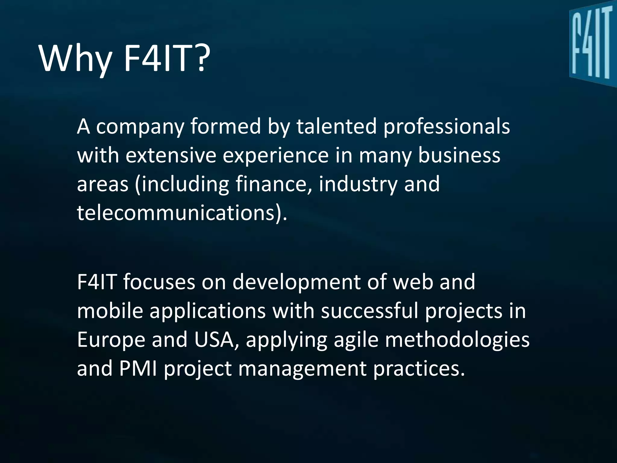 F4IT is a software development company formed by experienced professionals specializing in web and mobile applications. They focus on agile methodologies and have successful projects in Europe and the US. They have development centers in Salvador and Sao Paulo, Brazil, attracting many large companies with their experience, quality practices, and competitive rates for long-term partnerships. F4IT offers custom software development, training, and consultancy services using technologies like Java, .NET, Android and databases like Oracle and SQL Server.