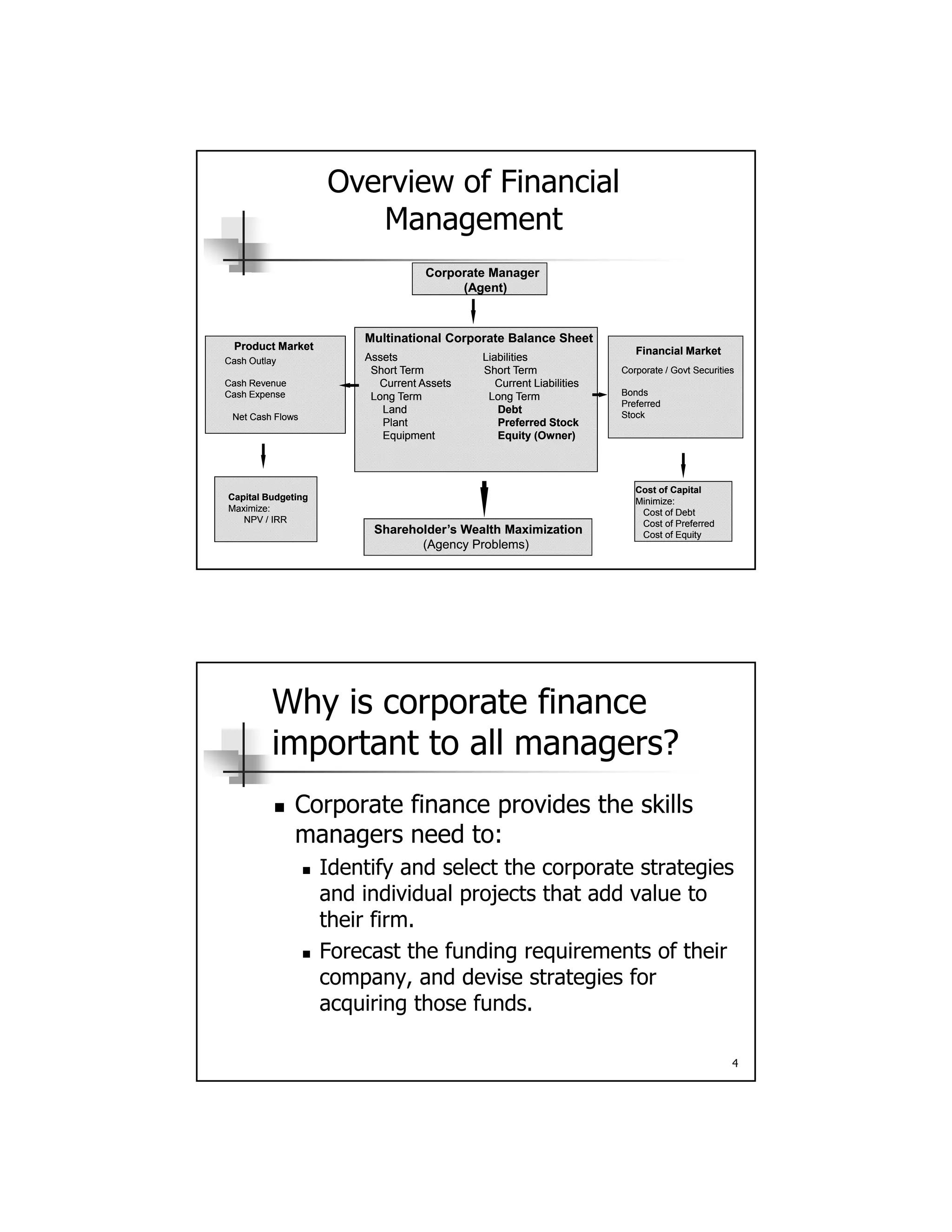 This chapter provides an overview of financial management and the financial environment. It discusses forms of business organization including sole proprietorships, partnerships, and corporations. The chapter explains that the primary objective of corporate managers should be to maximize shareholder wealth. It also outlines key concepts such as free cash flows, weighted average cost of capital, and how the cost of debt and equity capital are determined. The chapter concludes with a discussion of financial securities, primary and secondary markets, and how secondary markets are organized.