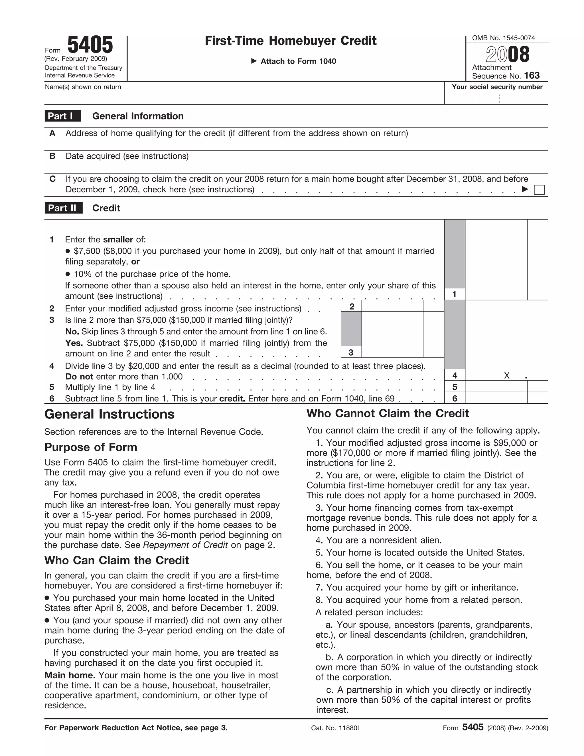 This document provides instructions for claiming the first-time homebuyer credit on IRS Form 5405. Key details include: