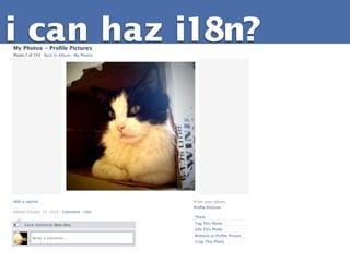 The document discusses the internationalization of Facebook over time. It notes that Facebook launched translations in 2004, initially aiming for 21 languages. By 2010, Facebook was available in over 60 languages. It also provides examples of machine translations and user translations on Facebook that resulted in unintended meanings or jokes among users.