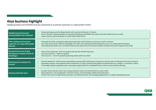 F88 Investment JSC is a rapidly growing financial services firm in Vietnam that provides lending and insurance products. It has over 520 branches nationwide and growing loan and insurance premiums of around 80% and 120% respectively each year. The company aims to serve Vietnam's large unbanked population and sees opportunities in title lending and insurance. It has a strong leadership team and corporate culture focused on its mission of expanding access to financial services in Vietnam.