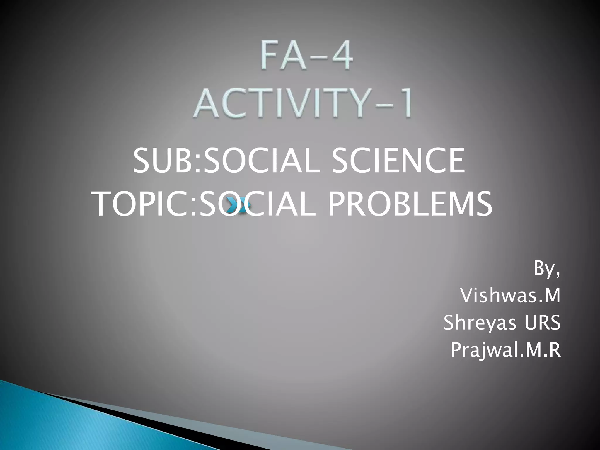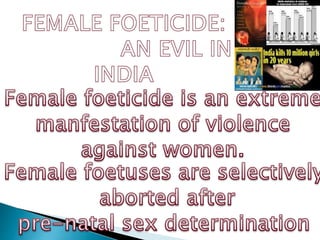 The document discusses several major social problems in Indian society, including poverty, the dowry system, child labour, corruption, population growth, and female foeticide. It provides statistics and details on each issue. Poverty is widespread in India, with over 30% of the population living below the international poverty line. The dowry system has resulted in mistreatment and deaths of brides. Child labour deprives children of their education and is harmful to their development. Corruption is a major problem that slows economic growth. India's high population growth rate strains resources. Female foeticide stems from a cultural preference for sons over daughters.