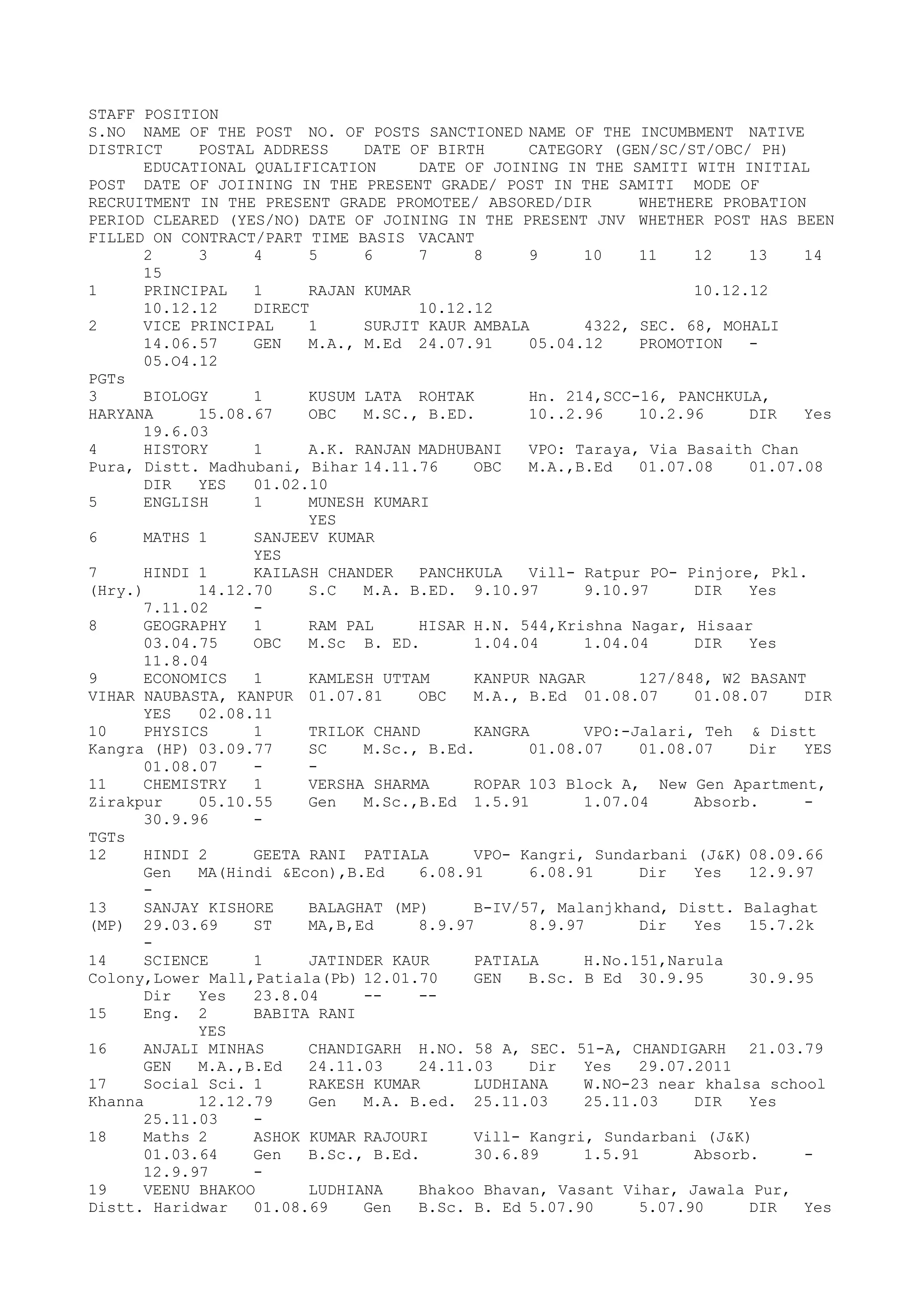 This document provides a staff position list for a school with 44 positions. It includes the name, native district, educational qualifications, date of joining, and other details for each position. The positions include the principal, vice principal, teachers for subjects like biology, history, and more. It also lists other staff positions such as the librarian, nurse, office assistant, and janitorial roles.