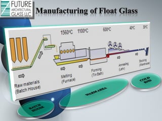 This document provides information on a glass manufacturing company including its facilities, machinery, processes, and specialized glass products. The company has large land plots and manufacturing facilities capable of automated cutting, arising, washing, grinding, fabrication, tempering, lamination, and insulation processes. It produces various types of coated, tinted, reflective, and low-e glass. Specialized glass divisions include products for facades, safety, curved tempering, ceramic fritting, glass creations, and more.