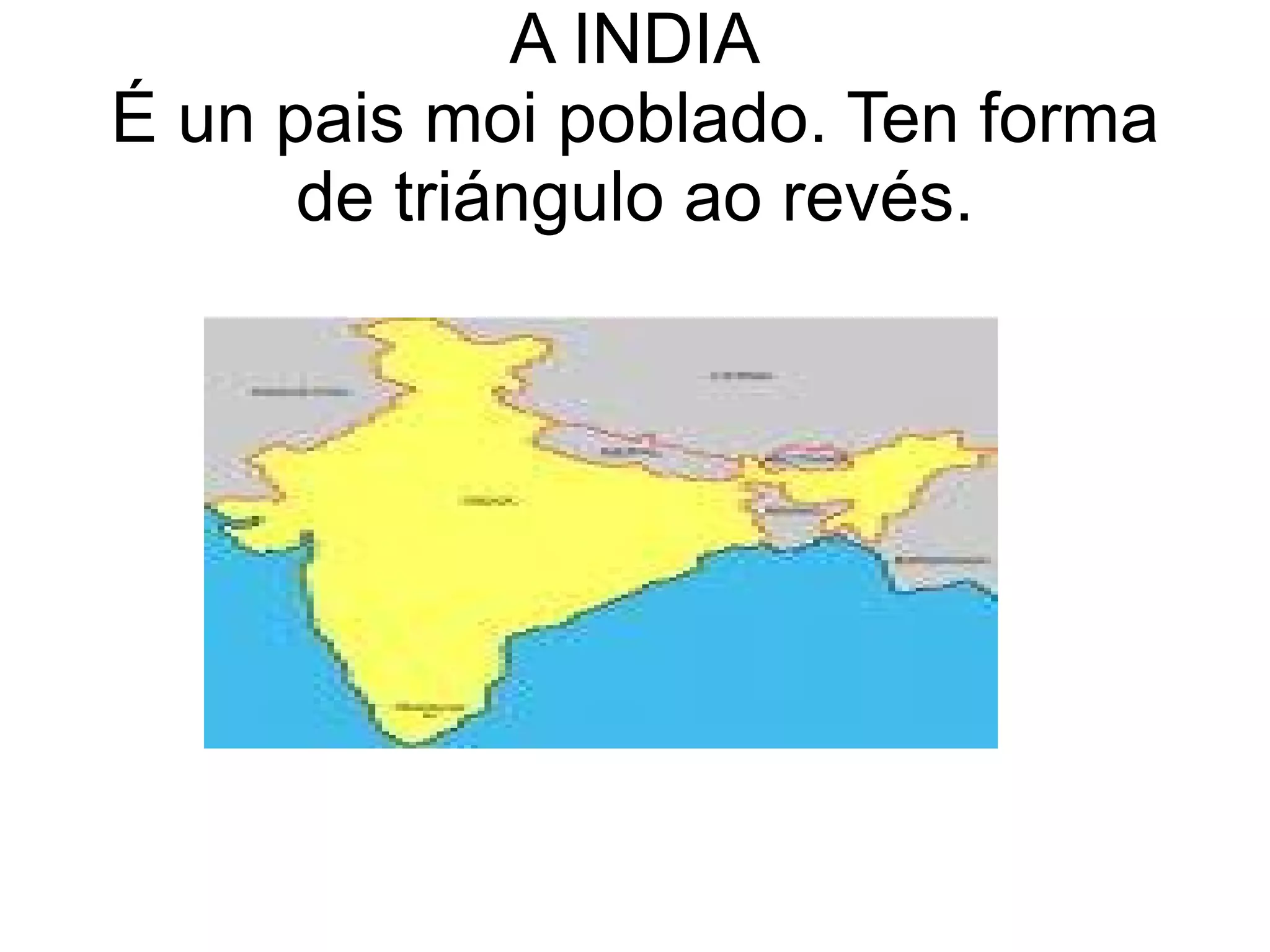 F:\A India 1. A INDIA É un pais moi poblado. Ten forma de triángulo ao revés. 2. 3. As vacas son sagradas na India, polo que non se poden molestar. 4. 5. É costume entre os indios saudarse dicindo namaste unindo as mans fronte o peito, baixo as meixelas. 6. O sari é vestimenta típica da India, os homes levan dhoti. 7. Os hindúes levan un punto vermello na frente, indica o estado civil, casado ou solteiro. 8. Os ingredientes máis importantes empregados na cociña india son o arroz , atta , un tipo especial de fariña de trigo integral e os legumes . A máis importante é a chana ( chícharo ), así como o toor ( garabanzo indio ), o urad ( lentella negra ) e o mung ( lentella verde ). 9. 10. O Taj Mahal é un mausoleo construido polo emperador musulmán Sha Jahan en honor á súa esposa preferida morta ao dar a luz. Taj Mahal significa “A Xoia do Palacio”. 11. 12. 13. 14. As cidades máis importantes son: Bombay, Calcuta. A súa capital e Nueva Delhi.