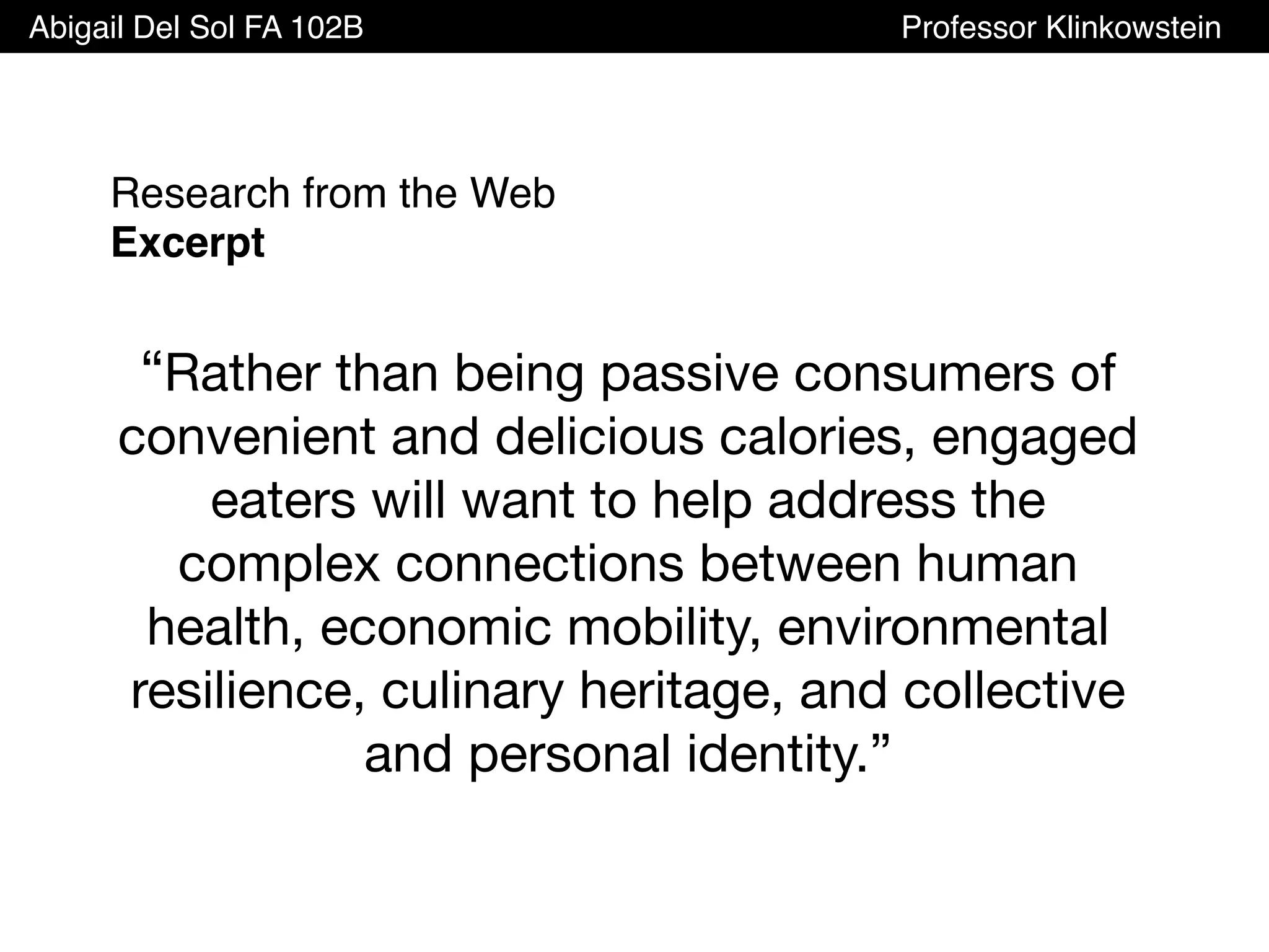The document discusses how engaged eaters will want to help address the complex connections between human health, economic mobility, environmental resilience, culinary heritage, and personal and collective identity. It notes that engaged eaters can help transition from unreliable information to knowledgeable purchasing, from distant farms and factories to local makers, and from passive consumers to innovation allies.
