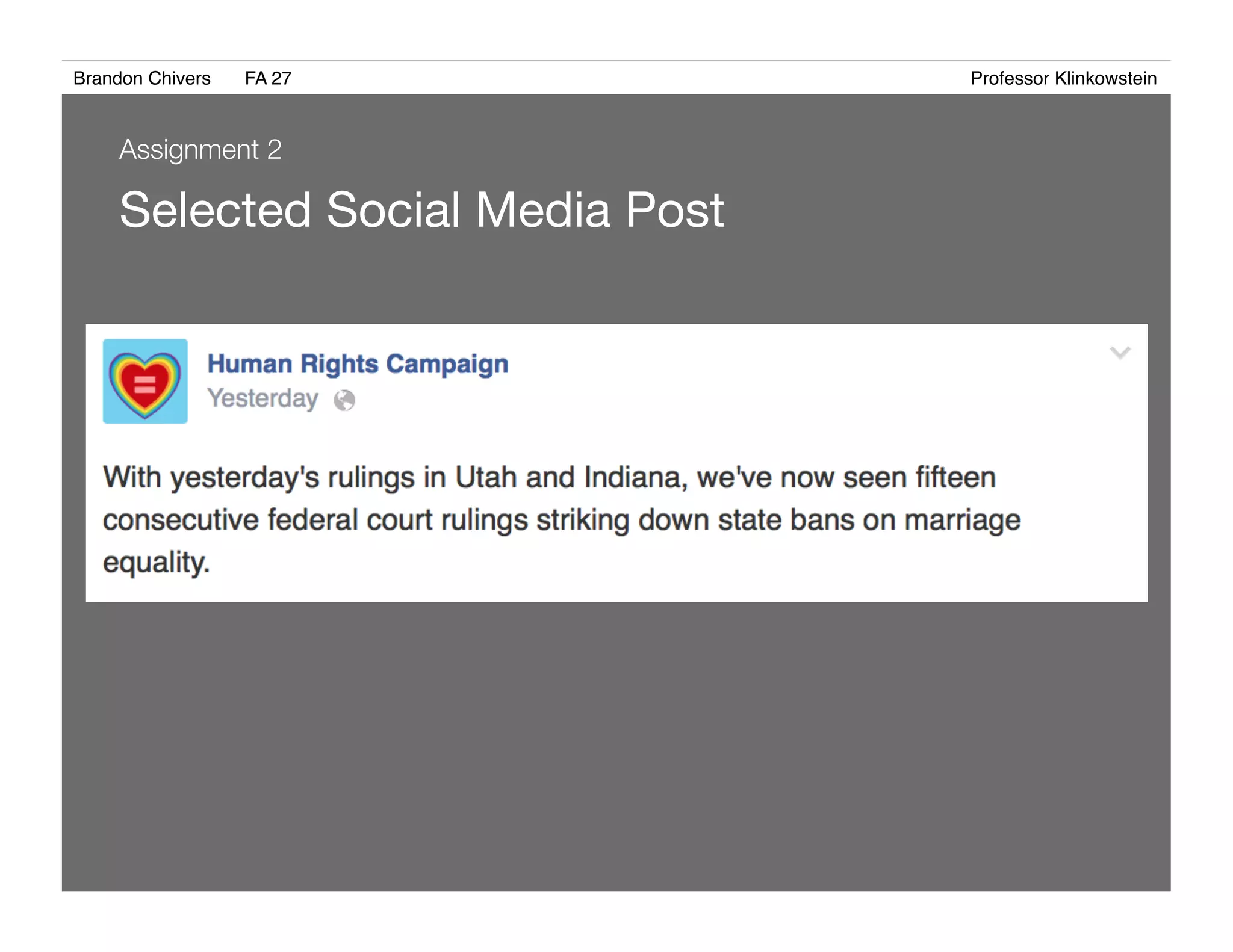 This document appears to be notes from a student named Brandon Chivers for several assignments submitted to Professor Klinkowstein. It includes summaries of research on topics like same-sex marriage bans and human rights issues. Later assignments involve working with images, designing a logo for a fictional organization called "Humantica", and creating materials like a t-shirt and book cover featuring the logo. The document shows Brandon's process and results for multiple graphic design and research projects.