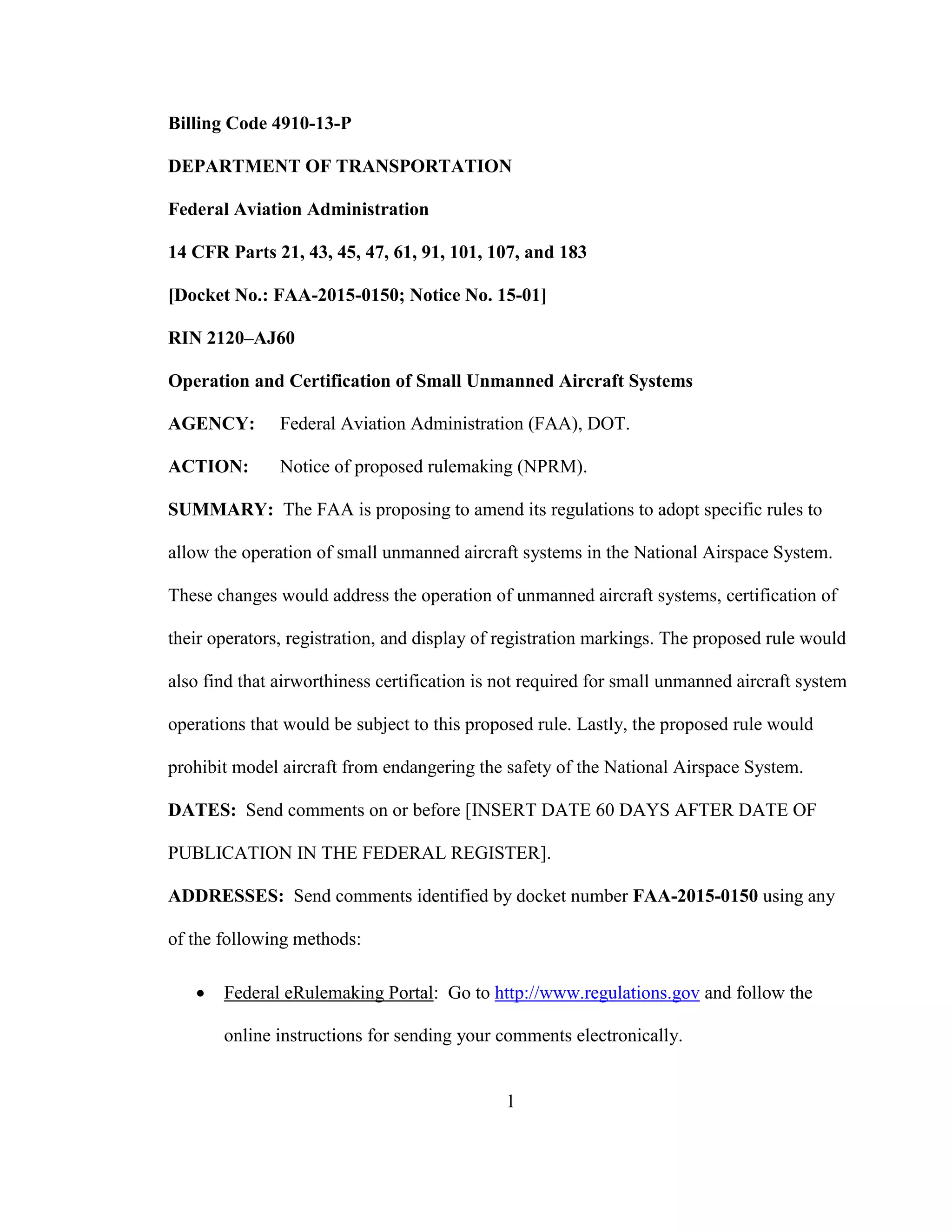 The FAA is proposing a new rule to allow routine civil operation of small unmanned aircraft systems (UAS) weighing less than 55 pounds in the National Airspace System. The proposed rule would establish specific operating rules to mitigate risk, including limiting operations to daylight hours, visual line of sight, confined areas, and below an altitude of 500 feet. It would also address aircraft registration and marking, operator certification requirements, and operational restrictions to ensure small UAS operations can safety and securely be integrated into the NAS.