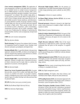 This document defines various terms related to aviation. It includes definitions for acceptable risk, aeronautical decision-making, aerodynamics, aircraft, airplane flight manual, airport/facility directory, air traffic control, attitude management, automated surface observing system, automated weather observing system, automatic terminal information service, autopilot, aviation medical examiner, aviation routine weather report, checklist, controlled flight into terrain, course, crew resource management, decision altitude, decision height, direct user access terminal system, emergency, en route flight advisory service, external pressures, Federal Aviation Administration, flight director indicator, flight level, flight management system, flightpath, general aviation, global navigation satellite system, global positioning system, hazard, hazardous attitudes, hazardous infl