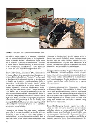 Three out of four aviation accidents result from human error. Studies of human behavior examine both innate and learned factors that influence human performance. The Federal Aviation Administration utilizes such studies to understand why pilots make mistakes and reduce human errors. Research has identified several traits common in pilots prone to accidents, including disdain for rules, impulsiveness, and disregard for outside information. In contrast, successful pilots demonstrate concentration, workload management, and the ability to perform multiple tasks simultaneously.