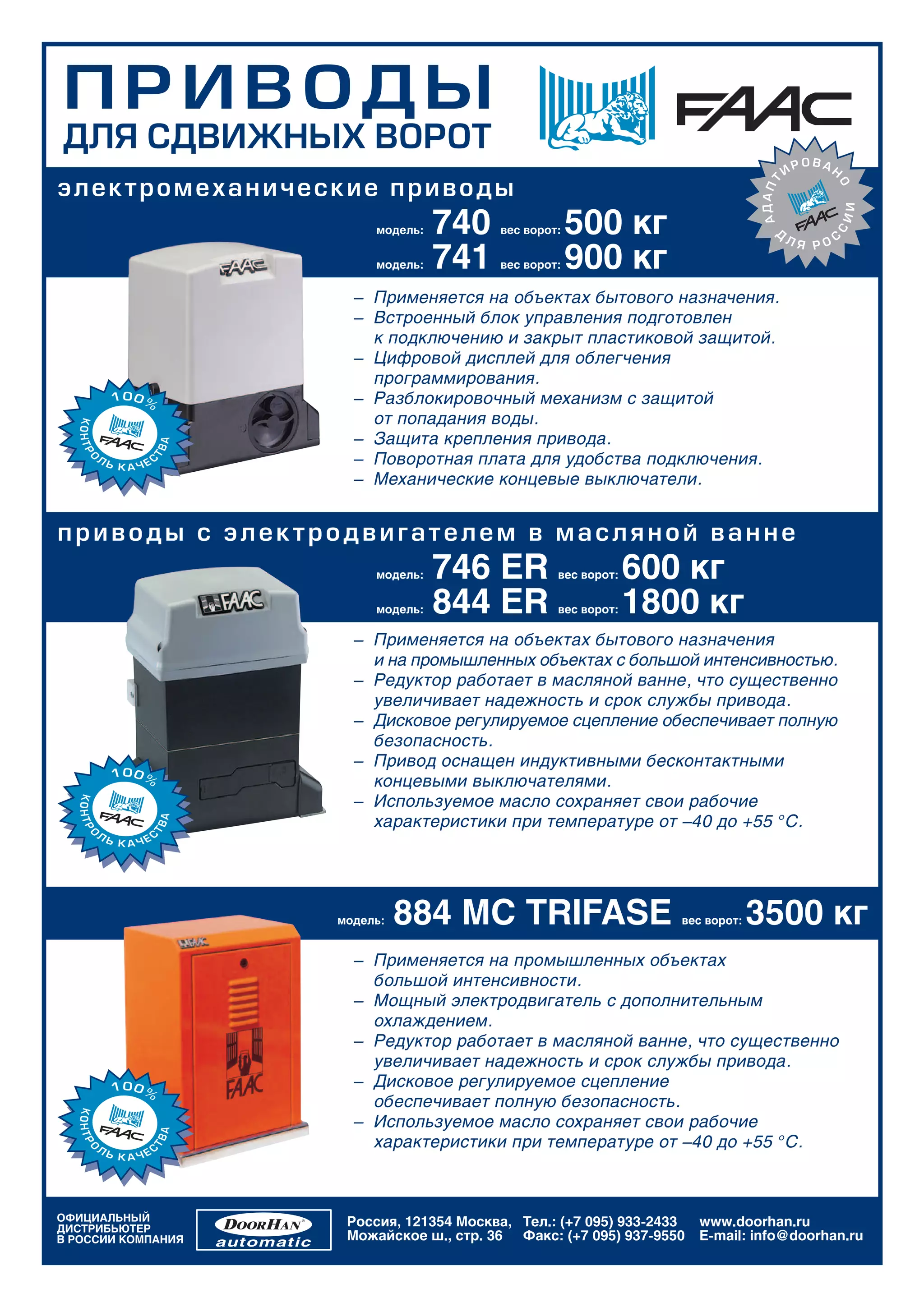 Документ содержит технические характеристики и описание различных моделей приводов и автоматических устройств для ворот и шлагбаумов, предназначенных для бытового и промышленного применения. Каждая модель представлена с указанием максимальной нагрузки, защиты от опасностей и рабочего диапазона температур, а также детальными характеристиками блока управления. Продукция соответствует европейским и российским стандартам качества.