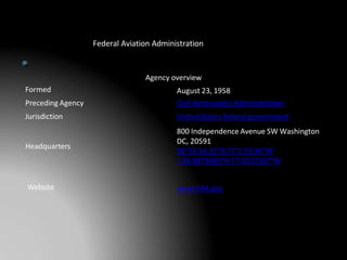 The Federal Aviation Administration (FAA) is the national aviation authority of the United States that regulates all aspects of American civil aviation. Formed in 1958, the FAA oversees air traffic control, aviation safety, commercial space transportation, airports, and the national airspace system. Headquartered in Washington D.C., the FAA has over 45,000 employees and operates nine regional offices across the country.