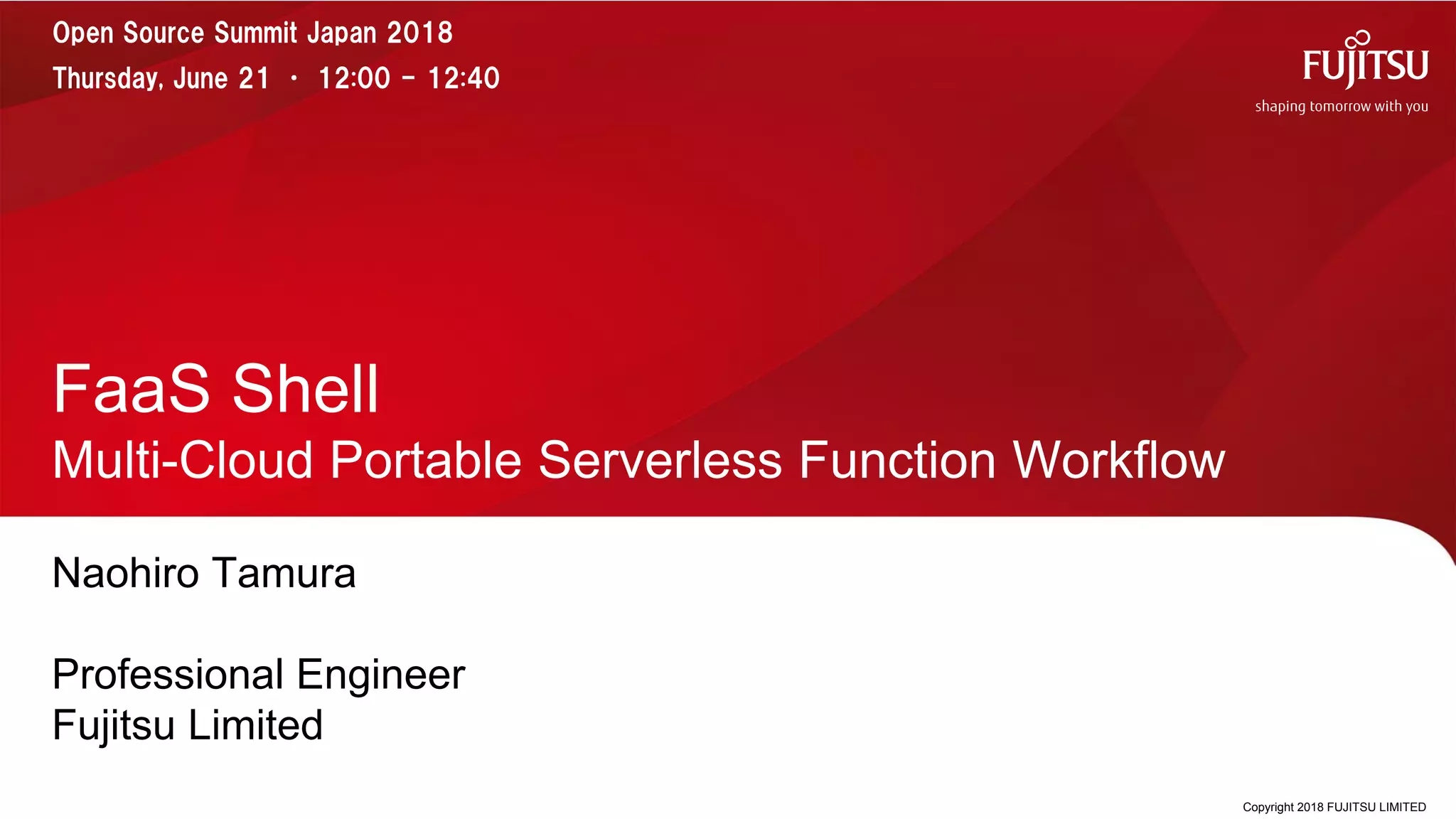 The document presents an overview of FaaS Shell, a tool that enables the use of serverless functions across multiple cloud platforms, addressing the challenges of interoperability among them. It outlines the workflow associated with serverless functions, the advantages of using FaaS Shell for multi-cloud strategies, and provides various implementation demos, including a translation service evaluation across different cloud providers. The presentation highlights the future of serverless function workflows and encourages user interaction and feedback.
