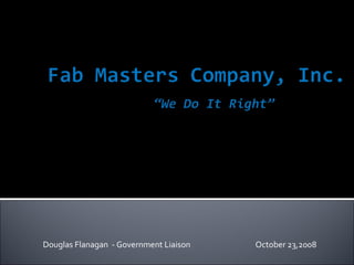 Fab Masters Company is a premier metal fabrication company that has been in business since 1984. They have experienced significant growth, with sales increasing from $3.4 million in 2005 to $10.5 million in 2008. They employ over 135 people and have an array of CNC machining centers and other equipment. Fab Masters specializes in services like welding, milling, and cutting and aims to meet customers' needs through high quality work.