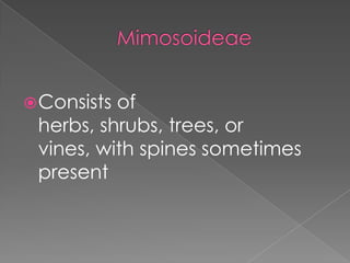 This document describes the characteristics of plants in the Fabaceae subfamily Mimosoideae. Key features include: