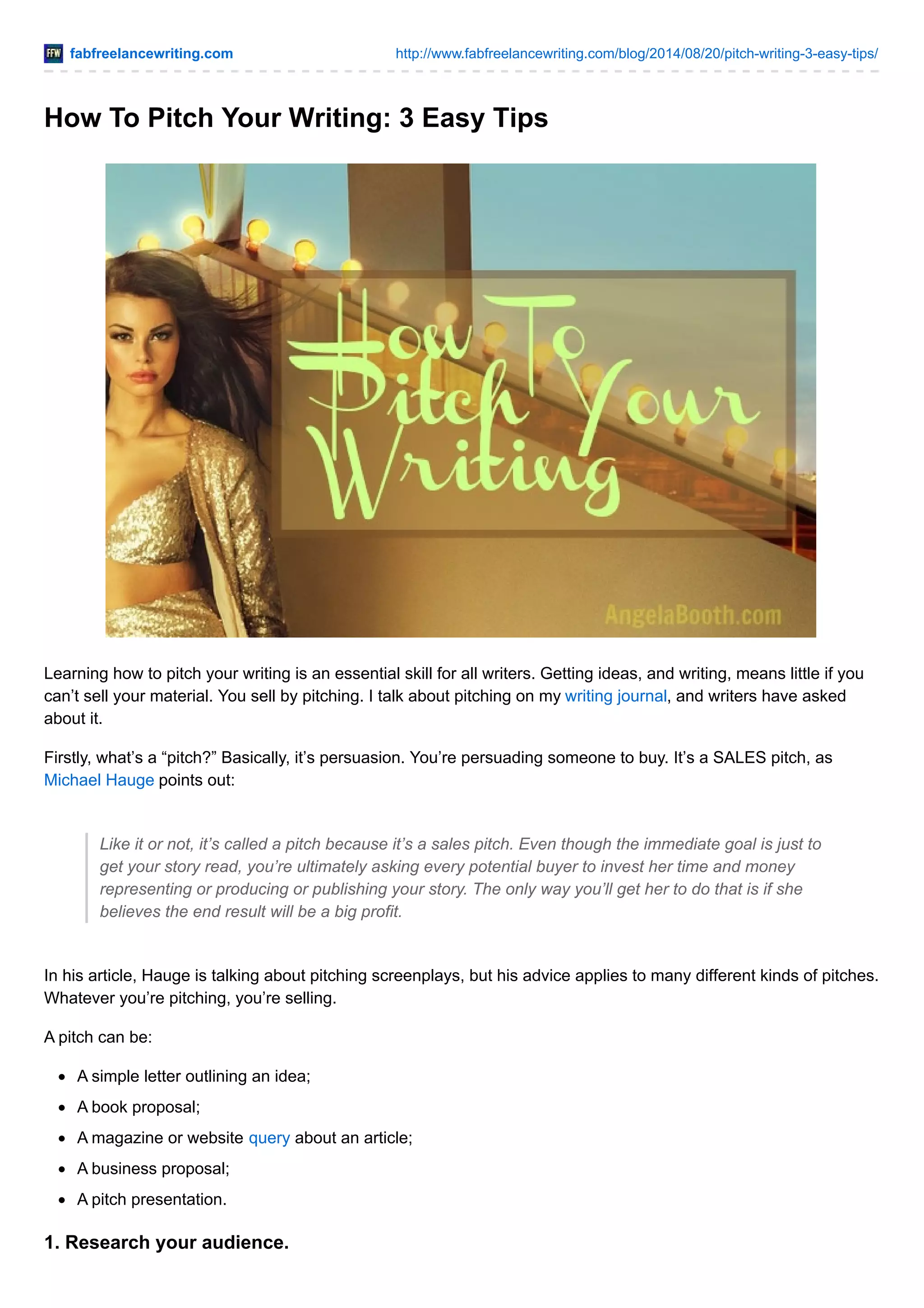The document provides three essential tips for effectively pitching writing ideas, emphasizing the importance of research, practice, and persistence. Writers should focus on the needs of their audience, create numerous pitches to get comfortable, and regularly ask for opportunities to pitch their work. Ultimately, consistent pitching can significantly increase a writer's job opportunities and income.